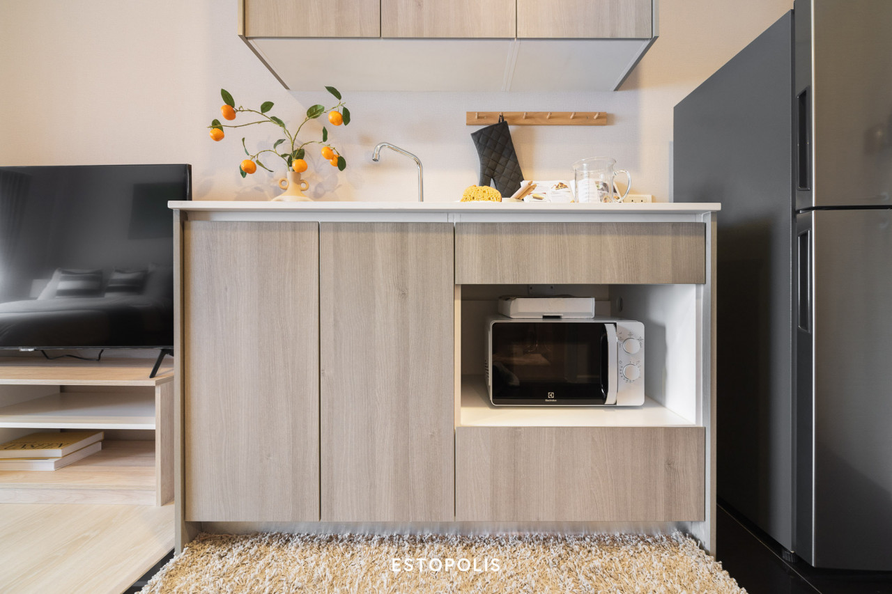 เคาน์เตอร์ครัวจะปิดหน้าบานลายไม้สีน้ำตาลดูสวยงาม มีช่องสำหรับใส่ไมโครเวฟมาให้เรียบร้อย รับรองเลยว่าถูกใจผู้ที่ชอบทำอาหารอย่างแน่นอน