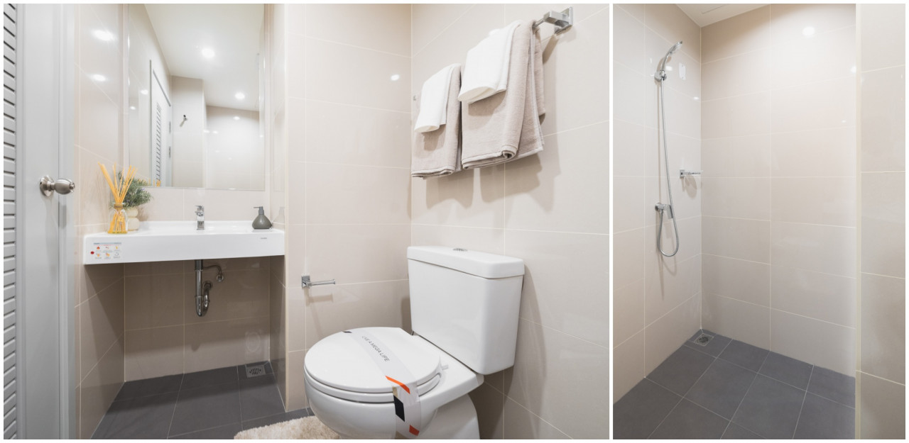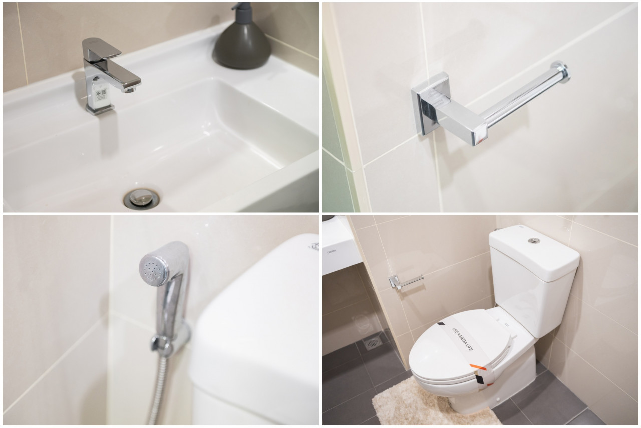 สุขภัณฑ์ภายในห้องน้ำจะมีให้ทั้งอ่างล้างหน้า ที่ใส่กระดาษชำระ สายฉีดชำระ และโถสุขภัณฑ์ ไปจนถึงติดตั้งพัดลมดูดอากาศมาให้ด้วย