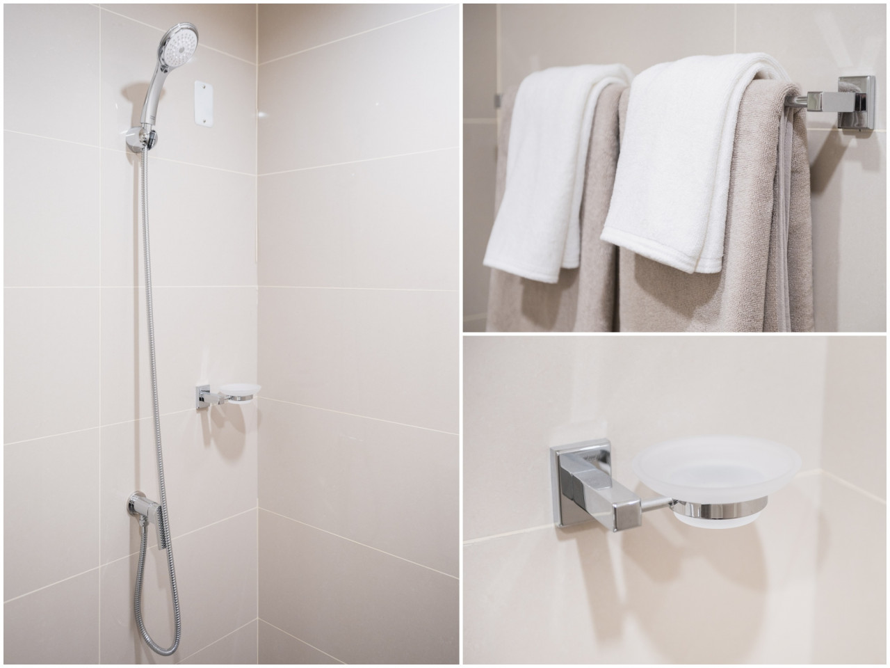 ทางฝั่งโซนเปียกก็จะมีฝักบัวแบบ Hand Shower มาให้ พร้อมที่ใส่สบู่ และราวแขวนผ้า พื้นที่กว้างพอให้ติดตั้ง Shower Screen เพิ่มเติมสำหรับกันน้ำกระเด็นออกไปได้