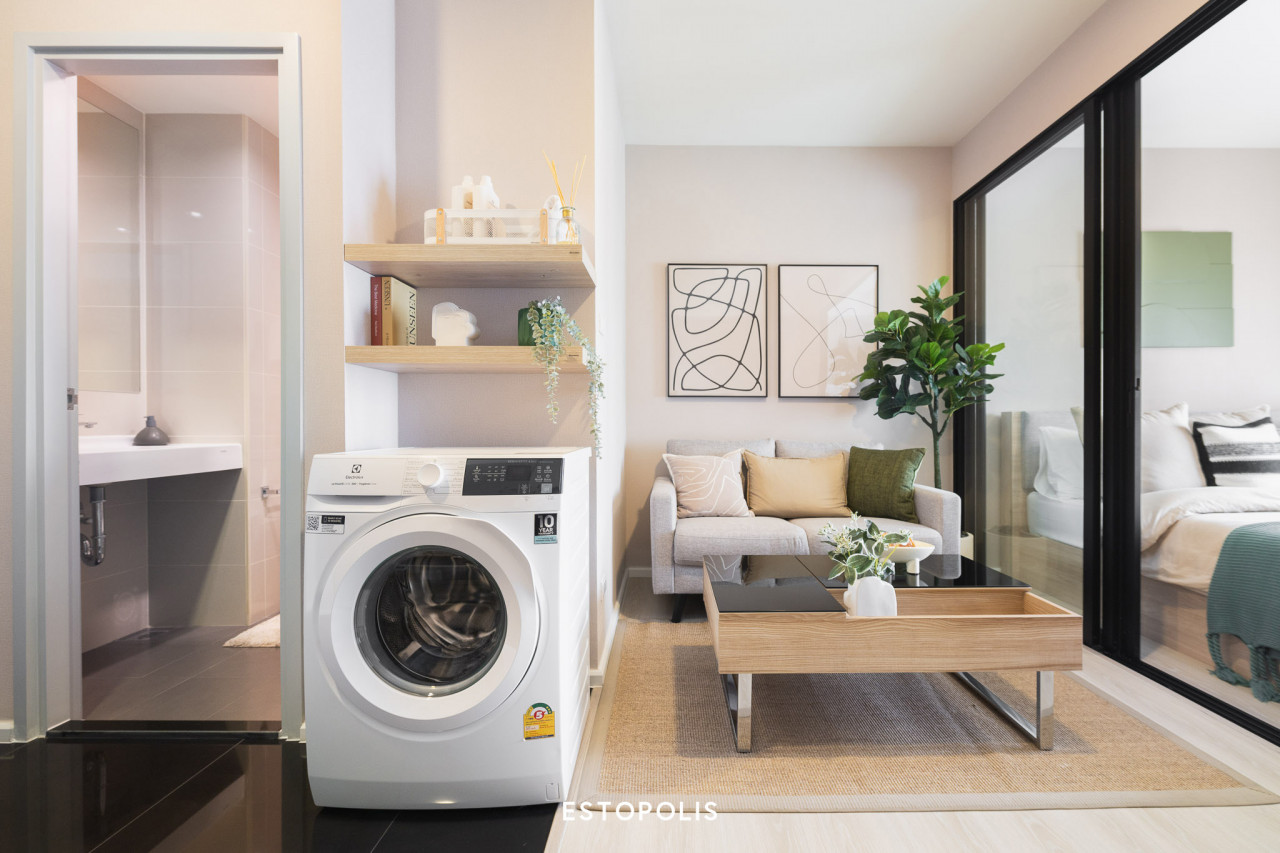 บริเวณห้องน้ำจะเชื่อมต่อสู่โซนห้องนั่งเล่น บริเวณนี้มีพื้นที่ให้วางเครื่องซักผ้า หรือต่อเติมเป็นพื้นที่เก็บของด้านบนได้สบายๆ
