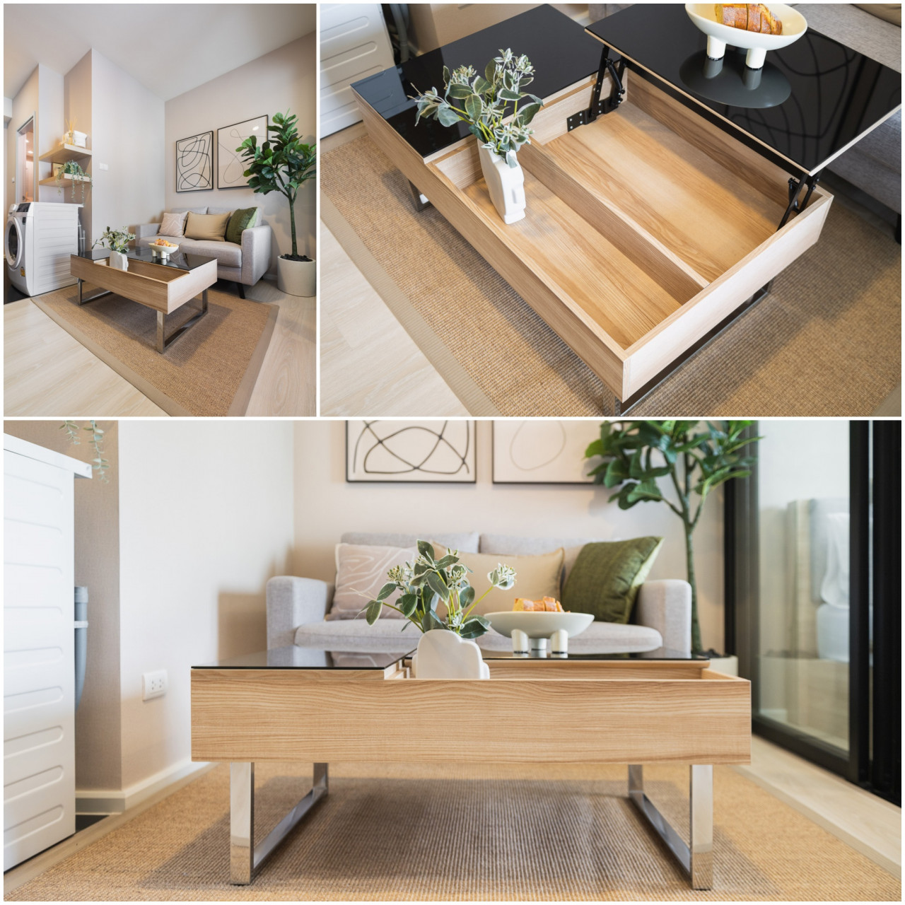 สำหรับโซฟาจะเป็นแบบ 2 ที่นั่งที่ขนาดกำลังพอดีกับขนาดห้อง เพิ่ม Duo Function ให้โต๊ะกาแฟดีไซน์เก๋ที่สามารถเพิ่มพื้นที่เก็บของได้อีกด้วยช่องลับใต้โต๊ะ และยกขึ้นเพื่อวางโน้ตบุ๊กให้อยู่ในระยะสายตาสำหรับนั่งทำงาน