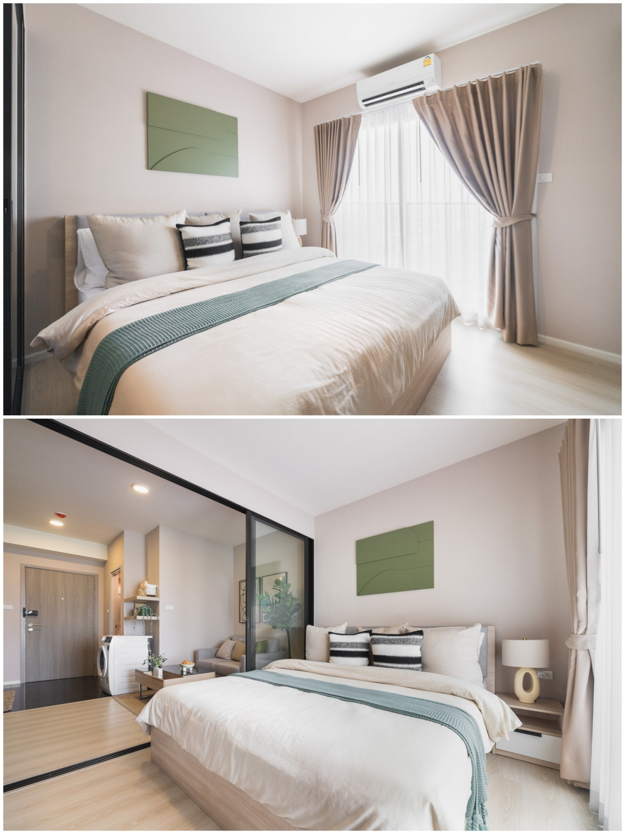 บริเวณภายในห้องนอนจะได้แอร์ 1 ตัว ได้ฐานเตียงขนาด 5 ฟุต ด้านข้างมีโต๊ะหัวเตียงไว้ใช้สำหรับวางของใช้หรือโคมไฟได้ ส่วนพื้นที่รอบเตียงก็เหลือไว้ให้เดินได้สบายๆ ไม่รู้สึกอึดอัดแต่อย่างใด