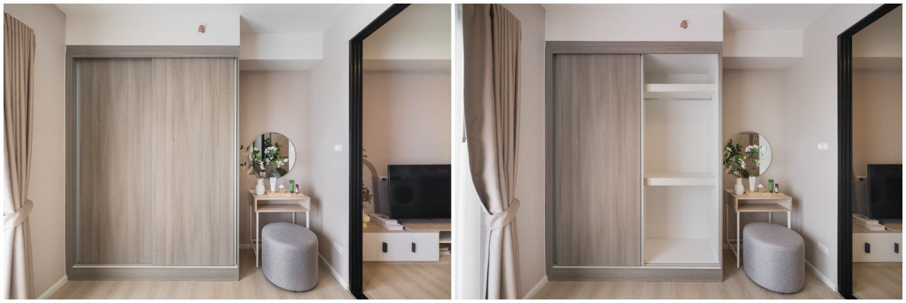 สำหรับบริเวณปลายเตียงจะเป็นตู้แบบ Built-in แบบบานเลื่อน 2 ฝั่ง ปิดผิวหน้าบานลายไม้ดูสวยงาม ซึ่งจุของได้เยอะและยังประหยัดพื้นที่ในการจัดวางอีกด้วย