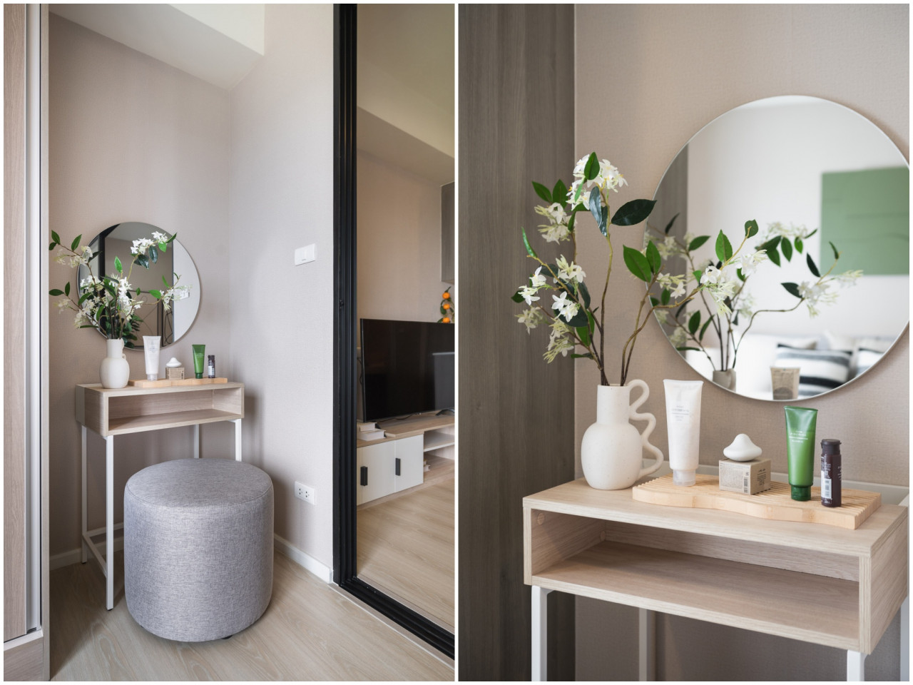 ส่วนด้านข้างตู้เสื้อผ้าจะเป็นโต๊ะเครื่องแป้งดีไซน์น่ารัก พร้อมกระจกและเก้าอี้สตูลที่ดูเข้าชุดกัน ซึ่งจุดนี้เหมาะที่จะตั้งโต๊ะเครื่องแป้งเพราะสามารถใช้แสงธรรมชาติช่วยในการแต่งหน้าได้ อีกทั้งยังสะดวกสำหรับการตรวจเช็กตัวเองหลังจากแต่งตัวเสร็จด้วยการส่องกระจกก่อนออกจากห้องอีกด้วย