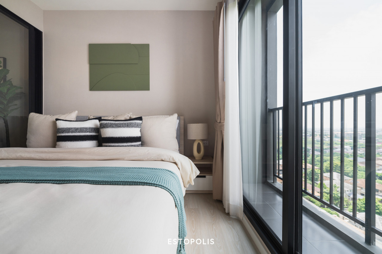 เปิดรับลมธรรมชาติสักเล็กน้อยด้วยประตูกระจกสีเขียวตัดแสงที่นำทางมายังพื้นที่ระเบียงแนวยาวขนานตัวห้อง ซึ่งก็สามารถนำเก้าอี้ตัวเล็กๆ มานั่งเล่น หรือปลูกต้นไม้เพื่อเพิ่มพื้นที่สีเขียวให้กับตัวห้องก็ได้เช่นกัน
