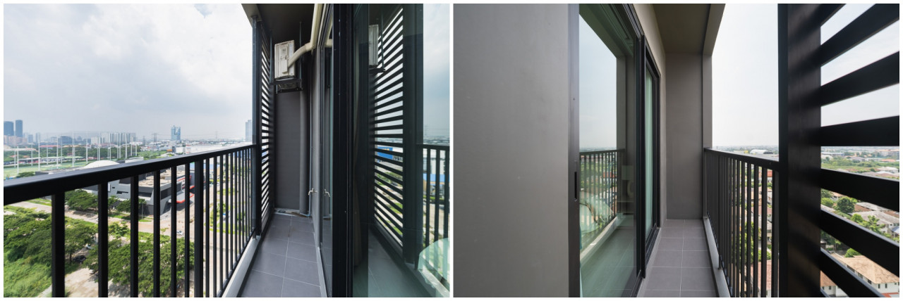 พื้นที่ระเบียงออกแบบมาให้เป็นแนวยาว มีการติดตั้งราวกันตกมาให้ พร้อมกับการวางคอมเพรสเซอร์แอร์แบบแขวนมาให้จึงทำให้บริเวณระเบียงไม่ร้อน สามารถเดินออกมายืนรับลมด้านนอกได้เลย