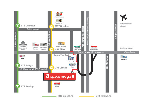 ในด้านทำเลของโครงการ A Space Mega 2 จะอยู่ติดกับห้างสรรพสินค้า Mega Bangna และ IKEA Bangna สามารถเดินเท้าไปได้ เหมาะกับไลฟ์สไตล์ของคนเมืองที่ชื่นชอบการช็อปปิง กิน เที่ยว และต้องการอยู่อาศัยในคอนโดที่สามารถตอบโจทย์วิถีชีวิตได้แบบครบครัน ส่วนในด้านการเดินทางนั้นก็เรียกได้ว่าค่อนข้างสะดวก เพราะไม่ไกลจากโครงการจะมีรถไฟฟ้าสายสีเหลืองช่วงลาดพร้าว – สำโรงตัดผ่าน โดยสถานีที่ใกล้ที่สุดจะเป็นศรีเอี่ยม ที่อยู่ห่างจากโครงการประมาณ 5.7 กิโลเมตร* หรือถ้าต้องการเดินทางไปสถานีรถไฟฟ้าสายสีเขียวก็สามารถใช้บริการ Shuttle Bus ที่จะจอดรับบริเวณ เมกา บางนา มาลงที่สถานีอุดมสุขได้เลย