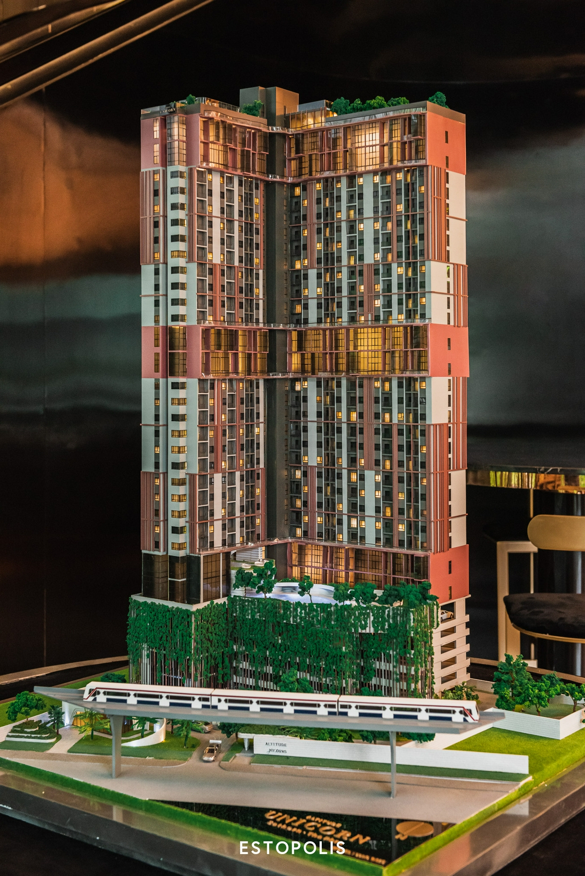 Altitude Unicorn Sathorn - Tha Phra คอนโดมิเนียม High Rise สูง 34 ชั้น ติดรถไฟฟ้า BTS สถานีตลาดพลู สำหรับภาพรวมของโครงการ หากมองจากตัวโมเดลจะแสดงให้เห็นถึงไลฟ์สไตล์ที่สะดวกสบายจากรถไฟฟ้าที่วิ่งผ่านหน้าโครงการ ตัวอาคารตกแต่งร่มรื่น ดูมีชีวิตชีวา และมีชั้น Loft สูง 4.6 เมตรทั้งหมด 3 ชั้น ที่ช่วยดึงความโดดเด่นของตัวอาคารขึ้นมาได้อย่างลงตัว