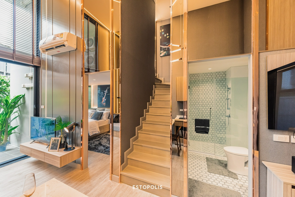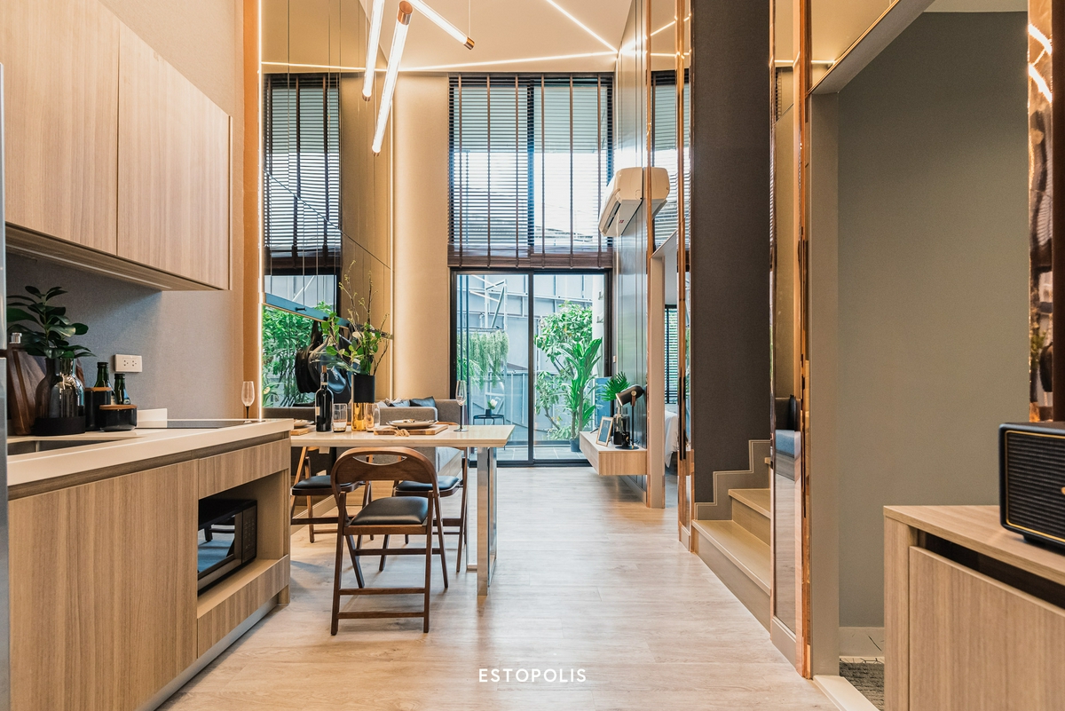 ห้อง Loft 1+1 Bedroom ขนาด 50.78 ตร.ม. จะเป็นห้องแบบ 2 ชั้น ที่ให้ความรู้สึกใกล้เคียงกับการอาศัยอยู่บ้าน มีความสูงระหว่างพื้นถึงเพดานครัว และห้องนั่งเล่นมากถึง 4.6 เมตร ส่วนบริเวณห้องน้ำกับห้องนอนจะสูงประมาณ 2.3 เมตร นับว่าห้อง Type นี้ค่อนข้างให้ความโปร่งสบายได้มากทีเดียว