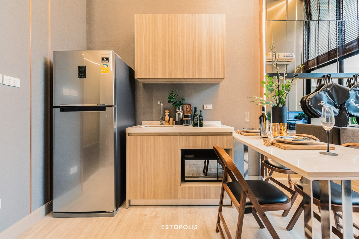 สำหรับ ‘โซนครัว’ ที่โครงการ Altitude Unicorn Sathorn – Tha Phra ให้มานั้น จะมีขนาดพอเหมาะสำหรับการประกอบอาหารเบา ๆ แบบอุ่นร้อนมากกว่า โดยฝั่งซ้ายสุดจะเป็นพื้นที่สำหรับให้วางตู้เย็นขนาดใหญ่พร้อมปลั๊กไฟด้านหลัง คราวนี้มาดูที่ตัวเคาน์เตอร์ครัวกันบ้าง ซึ่งทางโครงการก็ได้บิลต์อินตู้ตั้งพื้น และชั้นเก็บของแขวนผนังเอาไว้ให้ ติดกันจะเป็นโต๊ะทานข้าวตัวยาวพร้อมเก้าอี้นั่งอีก 3 ตัว ซึ่งเป็นตัวช่วยอย่างดีในการช่วยแบ่งสัดส่วนระหว่างครัวกับห้องนั่งเล่น