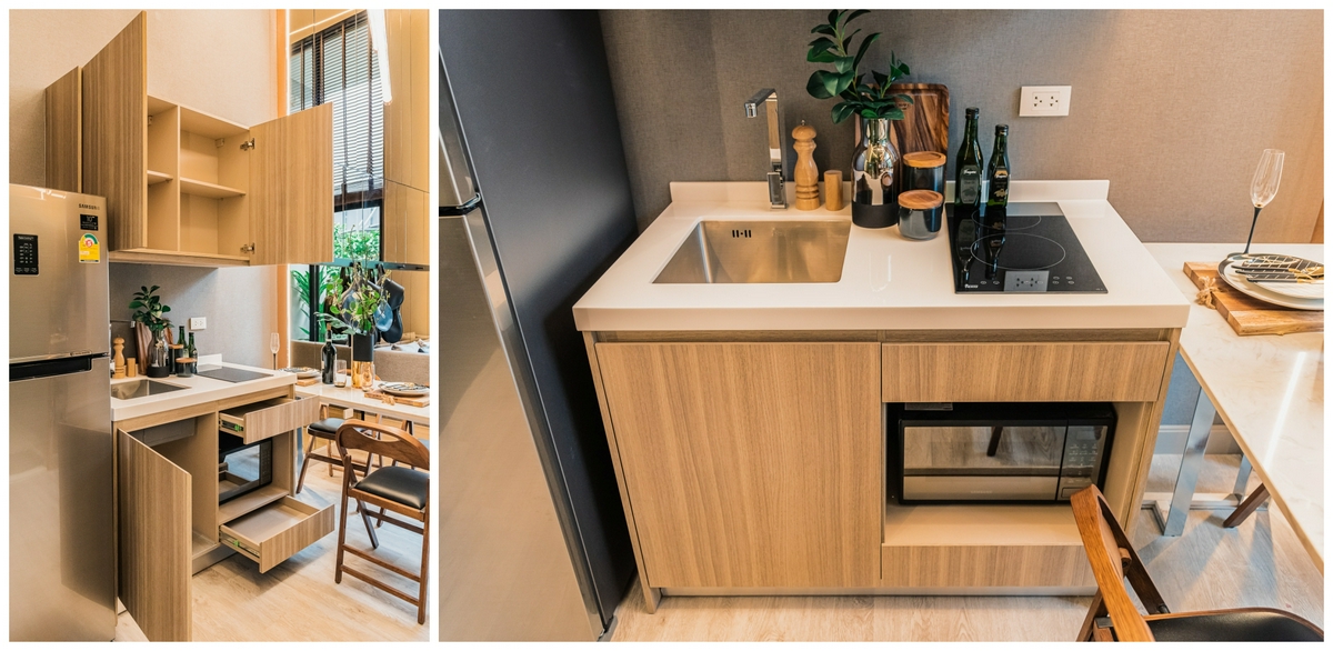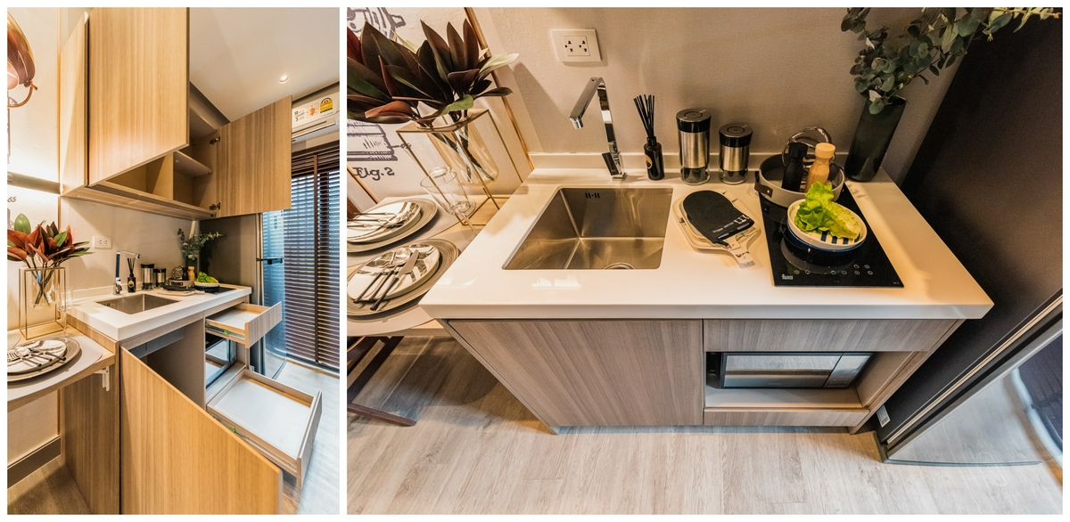 เคาน์เตอร์ครัวสามารถจัดเก็บอุปกรณ์ทำครัว, ภาชนะ, ช้อนส้อมต่าง ๆ , เครื่องปรุง และอาหารแห้งได้ค่อนข้างเยอะ พร้อมเว้นช่องสำหรับวางไมโครเวฟพร้อมปลั๊กไฟไว้ให้ด้วย ส่วนบริเวณท็อปครัว ทางโครงการก็จะให้ซิงก์ล้างจานสเตนเลสติดตั้งมาคู่กับก๊อกน้ำ มีเตาไฟฟ้าขนาด 2 หัว กับเครื่องระบายอากาศแบบปล่อยนอกอาคารจากแบรนด์ Teka มาให้