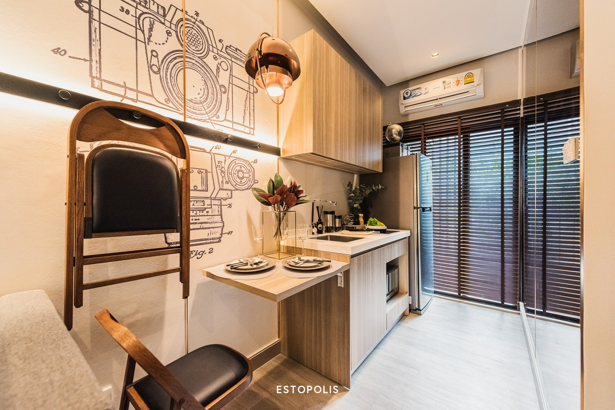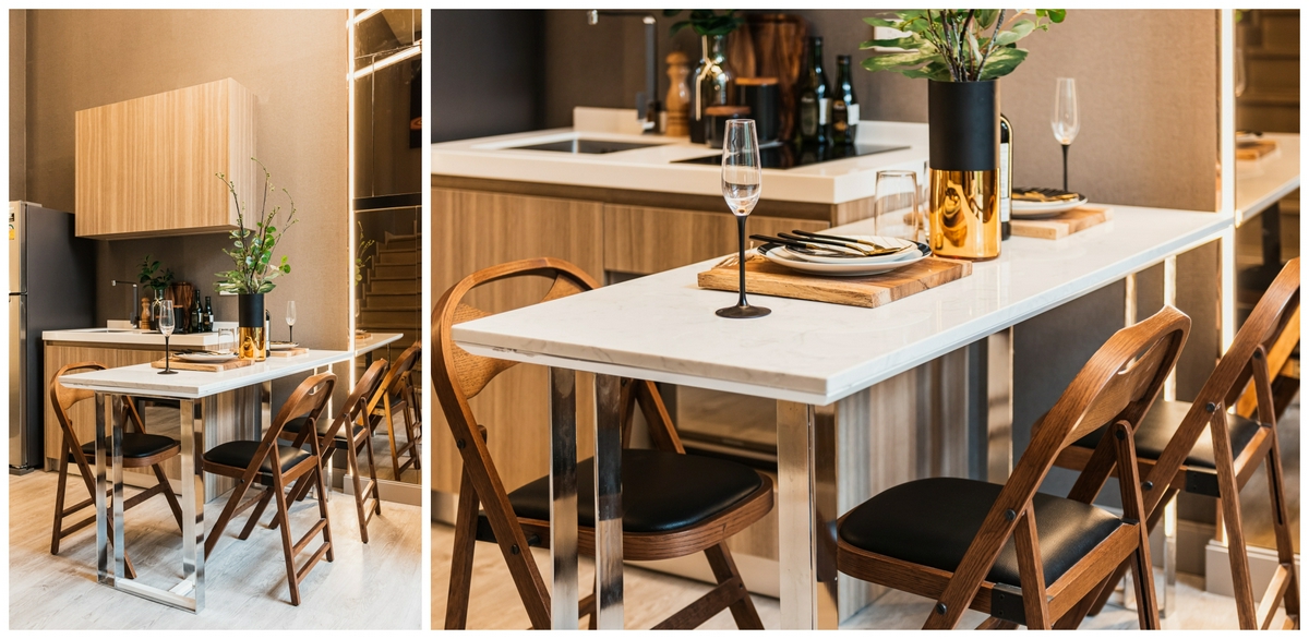 สำหรับโต๊ะทานข้าวแบบพับเก็บได้ที่ทางโครงการให้มานั้น จะสามารถนั่งทานพร้อมกัน 2 คนได้สบาย ๆ แถมเมื่อใช้งานเสร็จแล้วก็สามารถพับเก็บเพื่อเพิ่มพื้นที่ใช้สอยได้เลย หรือใครจะใช้เป็นพื้นที่เตรียมอาหาร สำหรับหั่น หรือจัดเตรียมวัตถุดิบก็ได้เหมือนกัน เรียกว่า สะดวกสบายเหมาะกับคนอยู่คอนโดยุคใหม่ ๆ จริง
