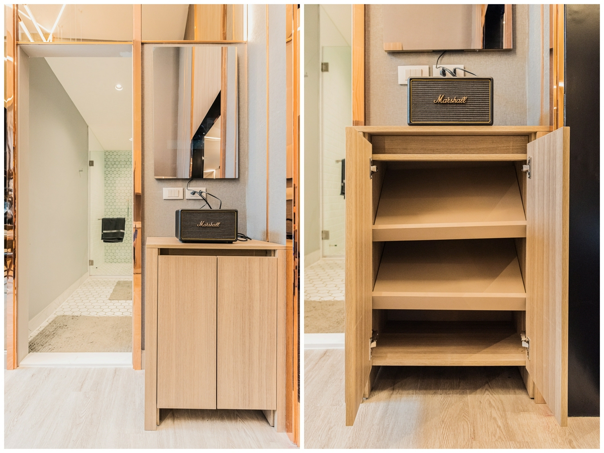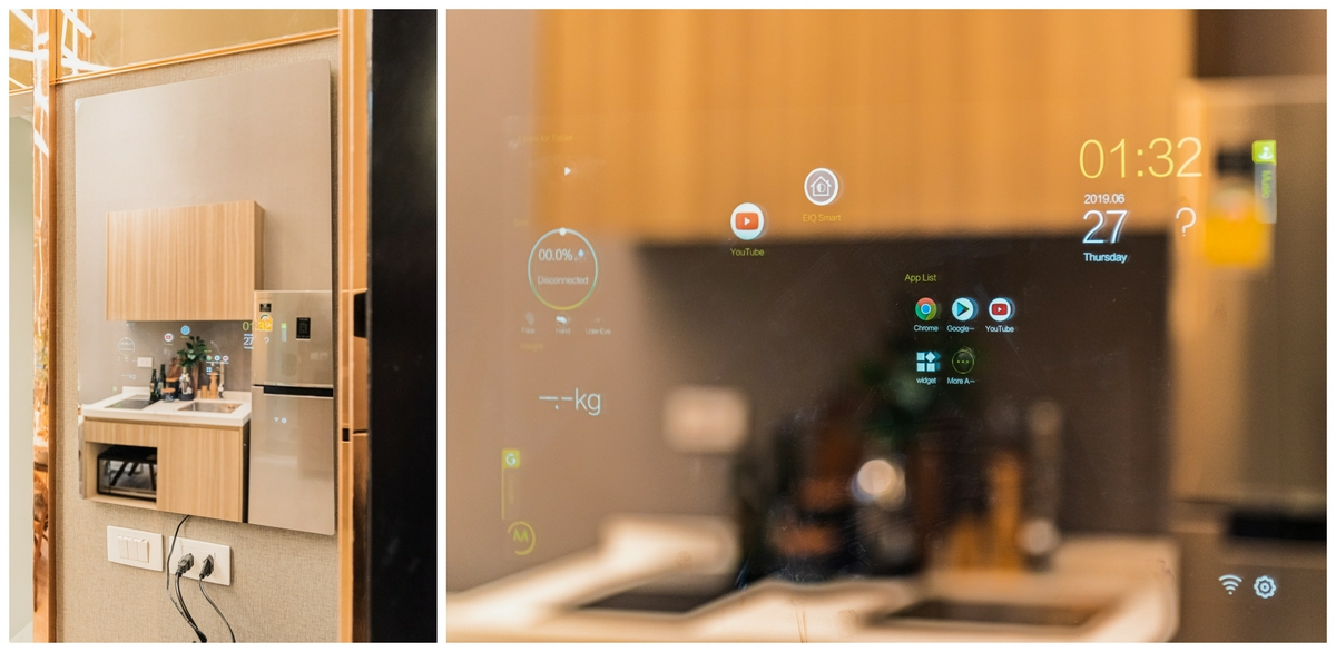 สำหรับ ‘Smart Mirror’ ที่ติดตั้งอยู่ด้านบนตู้เก็บรองเท้านี้ จะเป็นนวัตกรรมที่คล้ายกับตัว Tablet ซึ่งจะใช้ระบบ Android OS ในการเชื่อมต่อข้อมูลออนไลน์ ทำให้เราสามารถใช้งานยูทูป เพื่อเปิดเพลงฟังภายในห้องได้ทันที (หากใครสนใจก็สามารถติดต่อฝ่ายขาย เพื่อสอบถามโปรโมชันของ Smart Mirror ได้)