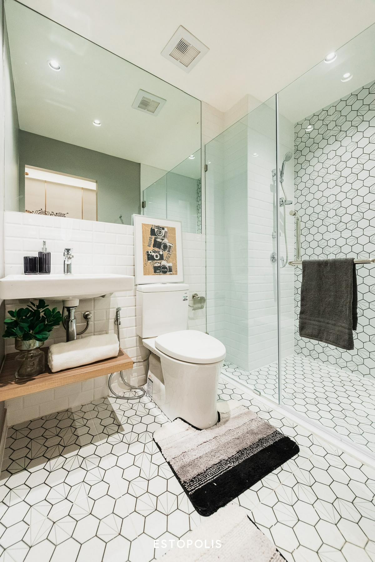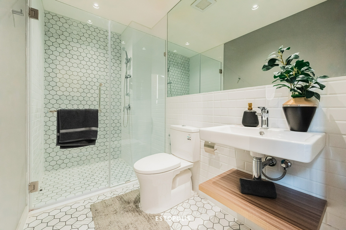 มาถึงพื้นที่สุดท้ายภายในห้อง Type 1 Bedroom อย่าง ‘ห้องน้ำ’ เมื่อเราเปิดประตูเข้าไป ด้านหน้าของเราจะเป็นอ่างล้างหน้าและโถสุขภัณฑ์ พร้อมกระจกเงาติดผนังขนาดใหญ่ ยาวไปถึง Partition ด้านในสุด ซึ่งจะเป็นส่วน Shower Box ที่ถูกกั้นด้วยกระจกนิรภัย เพื่อป้องกันน้ำกระเด็นออกมาด้านนอก