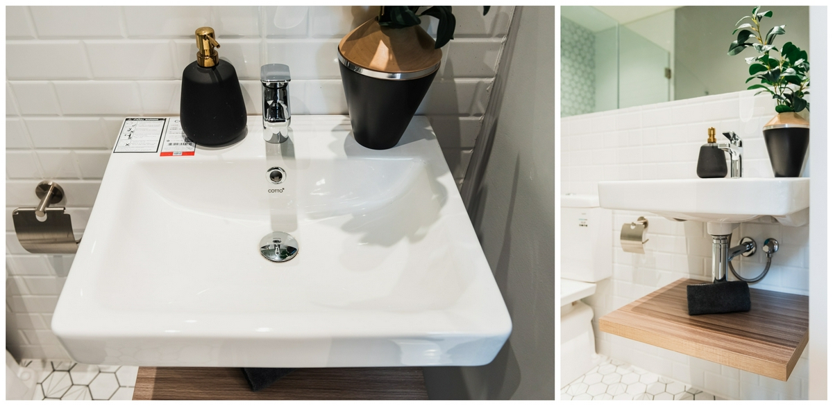- อ่างล้างหน้าและก๊อกน้ำจากแบรนด์ COTTO มาพร้อมกับชั้นวางของด้านล่าง