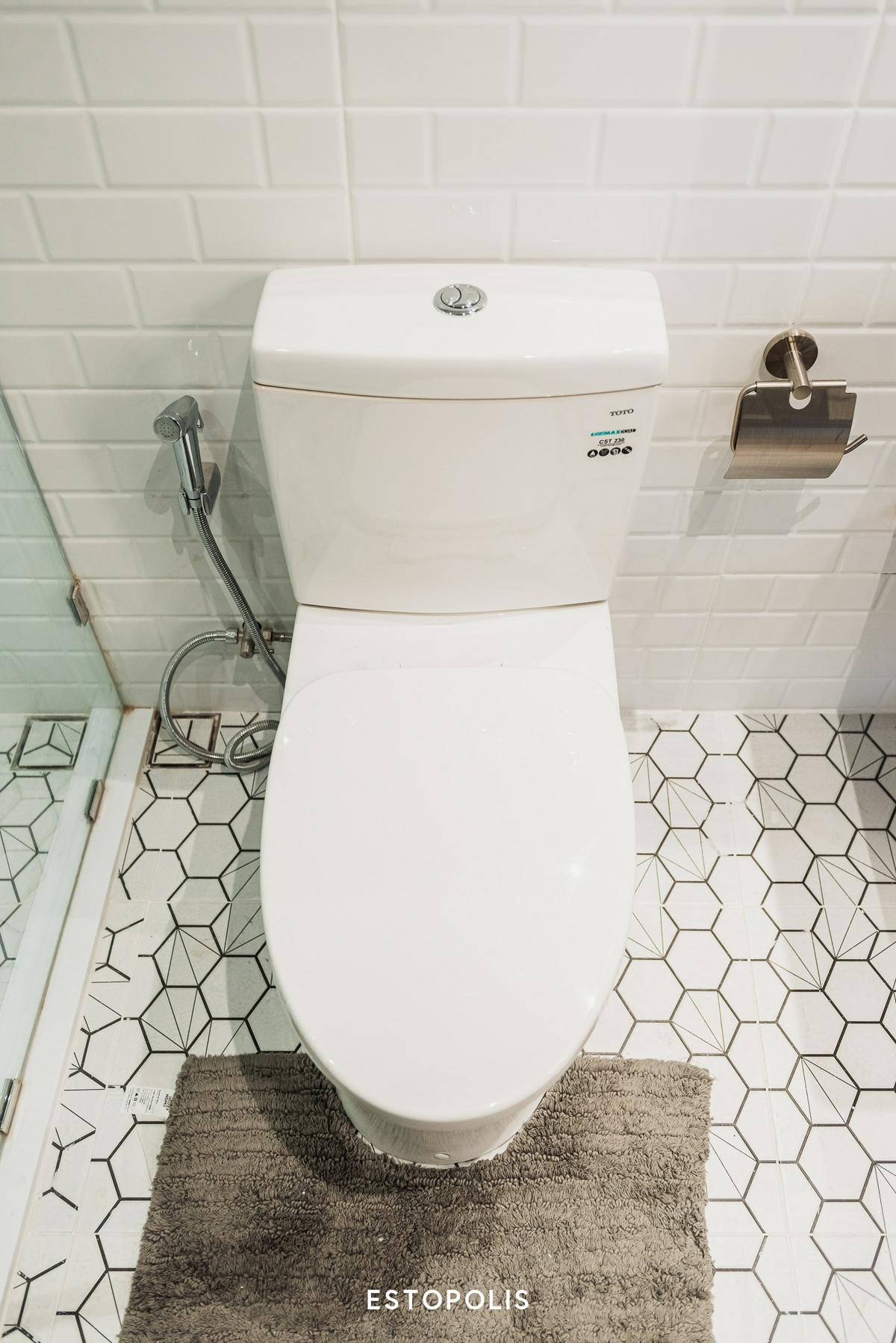 ถัดมาเป็นโถสุขภัณฑ์จากแบรนด์ TOTO พร้อมสายชำระ และที่ใส่กระดาษทิชชู่ เมื่อสังเกตที่ด้านในฝั่งสายชำระจะเห็นท่อระบายน้ำ เผื่อไว้สำหรับกรณีที่เกิดน้ำล้นออกมา