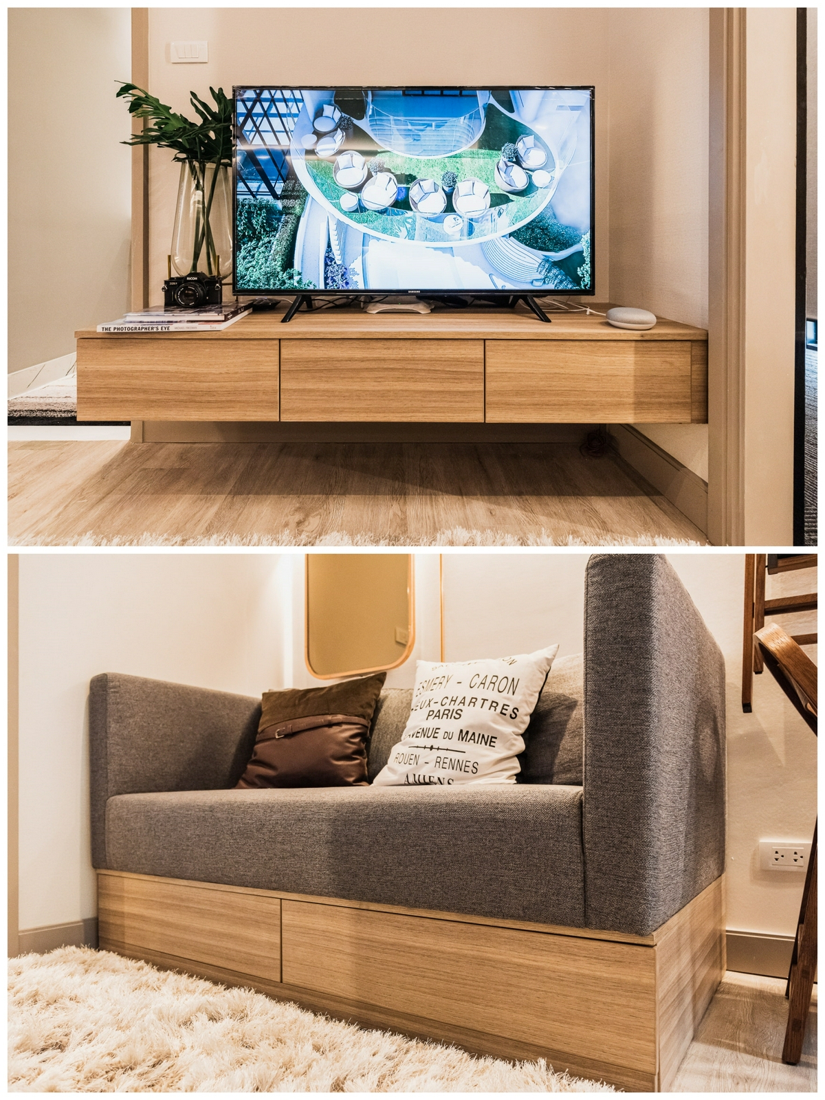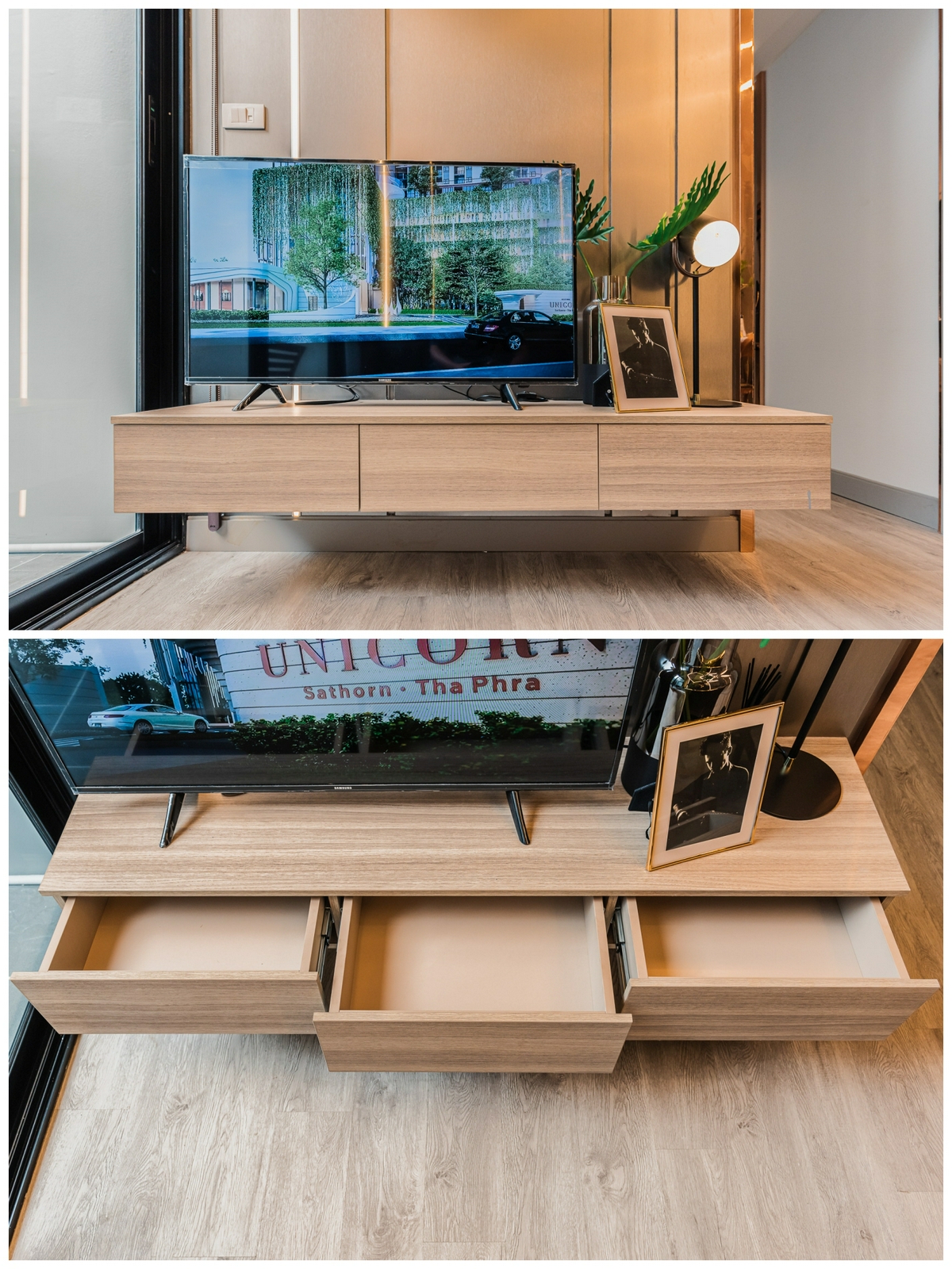 ในส่วนของชั้นวางทีวีที่ทางโครงการให้มานั้น จะเป็นแบบบิลต์อินติดผนังสูงขึ้นมาจากพื้นเล็กน้อย เราจึงดูแลรักษาความสะอาดได้ง่าย นอกจากนี้ยังแบ่งฟังก์ชัน ออกแบบเป็นลิ้นชัก 3 บาน ทำให้เราสามารถจัดเก็บของได้เพิ่มเติม ไม่ว่าจะจัดเก็บแผ่นหนัง หรืออุปกรณ์ข้าวของอื่น ๆ ก็จัดการได้ตามใจชอบ