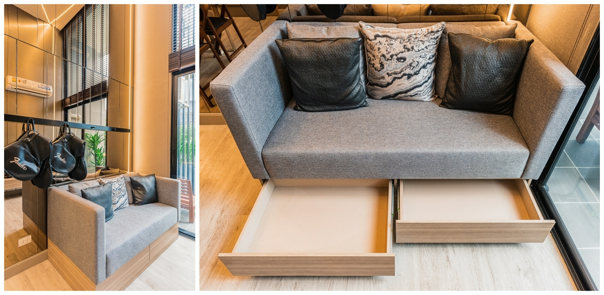 เพิ่มอรรถรสในการพักผ่อน ด้วยโซฟาตัวกลางที่ทางโครงการ Altitude Unicorn Sathorn - Tha Phra ยกมาตั้งไว้ให้กลางห้อง โดยด้านใต้ที่นั่งโซฟาจะซ่อนลิ้นชักเก็บของบานใหญ่ไว้ให้อีก 2 บาน เราจึงสามารถใช้จัดเก็บของได้ในตัวแบบมัลติฟังก์ชัน ซึ่งจะช่วยประหยัดพื้นที่ให้กับห้องได้มากทีเดียว