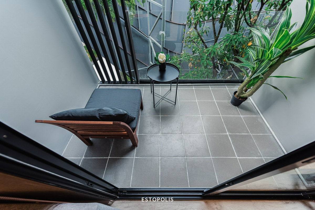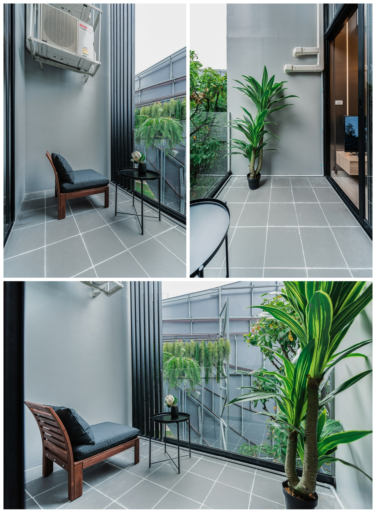 ถัดไปที่ส่วนของ ‘ระเบียง’ ห้องกันต่อเลย โดยพื้นที่ Outdoor นี้ ก็นับว่าสามารถใช้งานได้หลากหลาย ตกแต่งเป็นได้ทั้งมุมพักผ่อนเอนกาย ด้วยการนำโซฟาเบดสักตัวมาวางไว้ ให้เราได้นอนเหยียดกายชมวิวเมืองสวย ๆ, จัดเป็นมุมนั่งอ่านหนังสือ จิบกาแฟยามเช้า พื่อเติมพลังต้อนรับวันใหม่, ตกแต่งทำสวนสีเขียวขนาดย่อม ไว้เติมความสดชื่นมีชีวิตชีวาให้กับห้อง หรือจะใช้เป็นส่วน Laundry สำหรับงานซักล้างตากเสื้อผ้าของเราได้เหมือนกัน