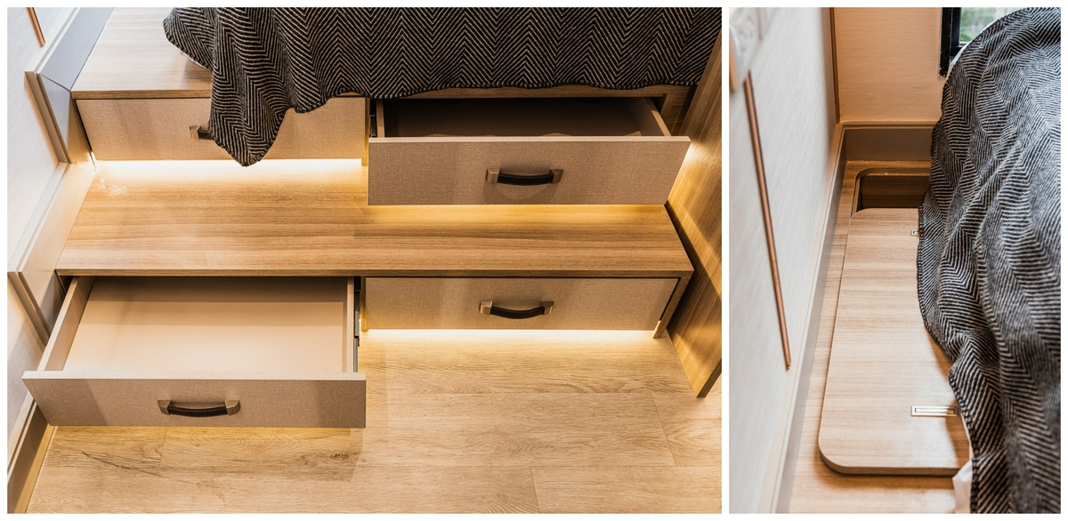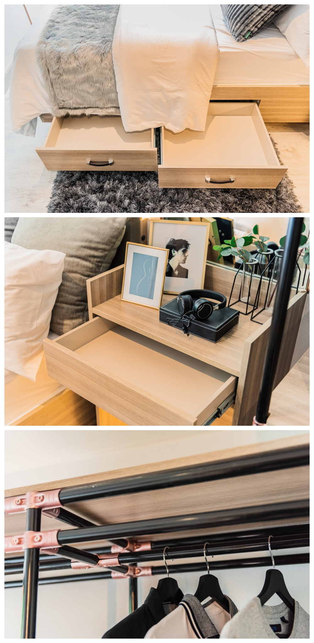 - ช่องเก็บของใต้เตียงมีขนาดใหญ่ สามารถจัดเก็บถุงเท้า, เสื้อชั้นใน รวมถึงชุดนอนต่าง ๆ เพื่อช่วยลดพื้นที่ในการจัดเก็บเสื้อผ้าได้