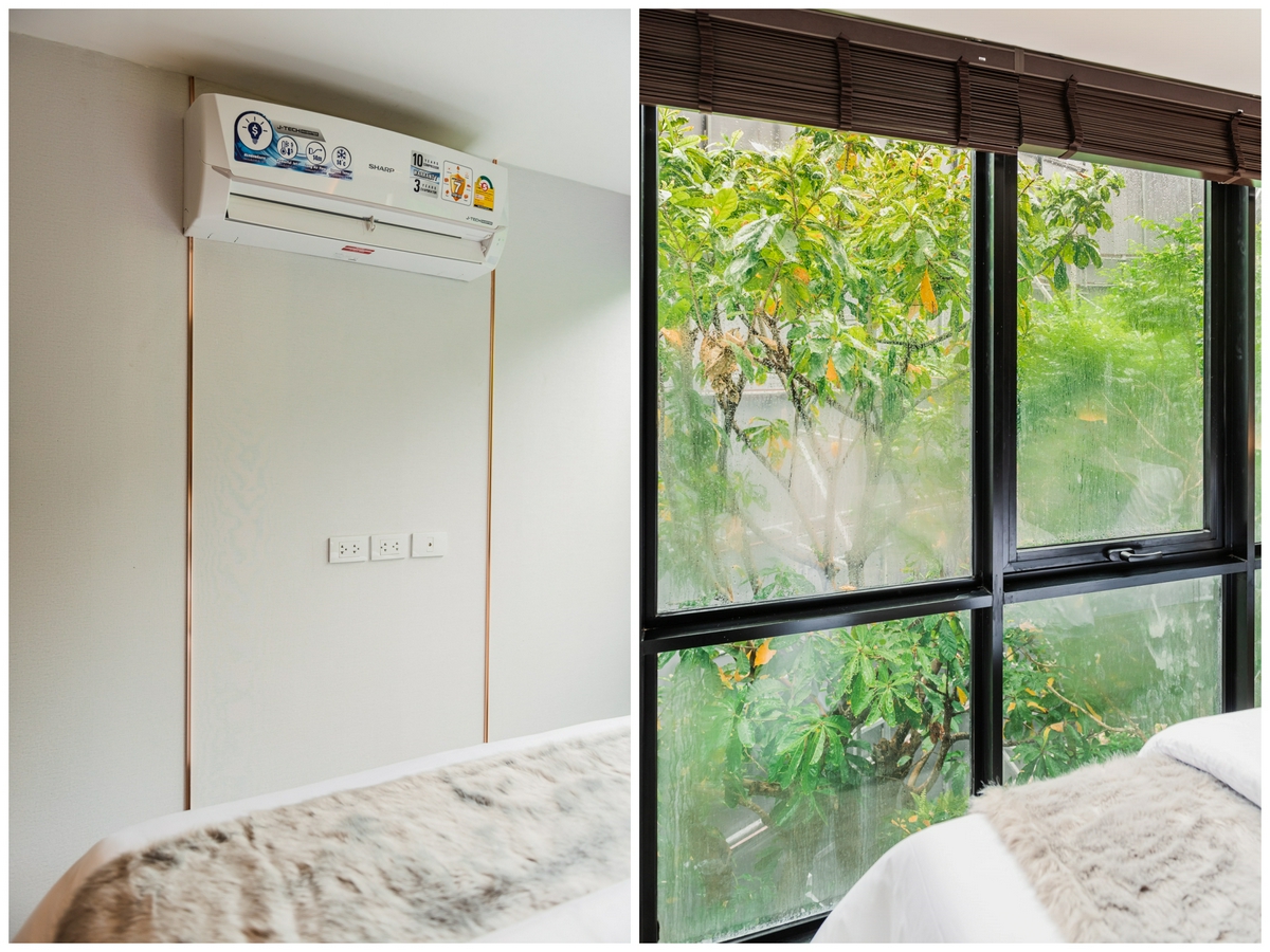สำหรับเครื่องปรับอากาศจะติดตั้งไว้ให้บริเวณปลายเตียง ขยับลงมาจะเจอปลั๊กไฟ และเคเบิ้ลทีวีสำหรับติดตั้งโทรทัศน์แบบแขวนผนัง ส่วนด้านข้างเตียงจะเป็นกระจกใสบานกระทุ้ง ที่สามารถเปิดออกออกเพื่อระบายอากาศ และรับลมธรรมชาติได้ดี
