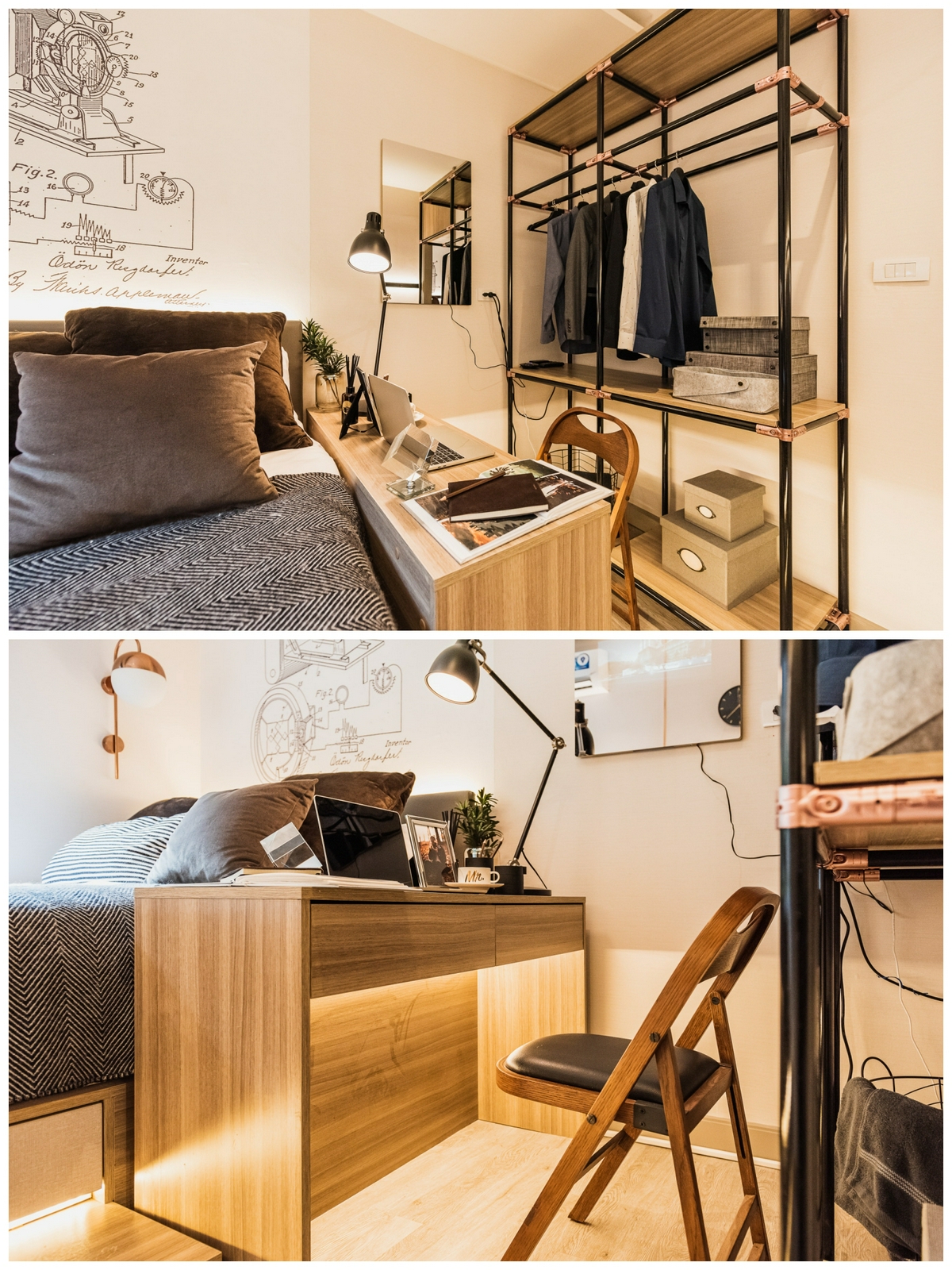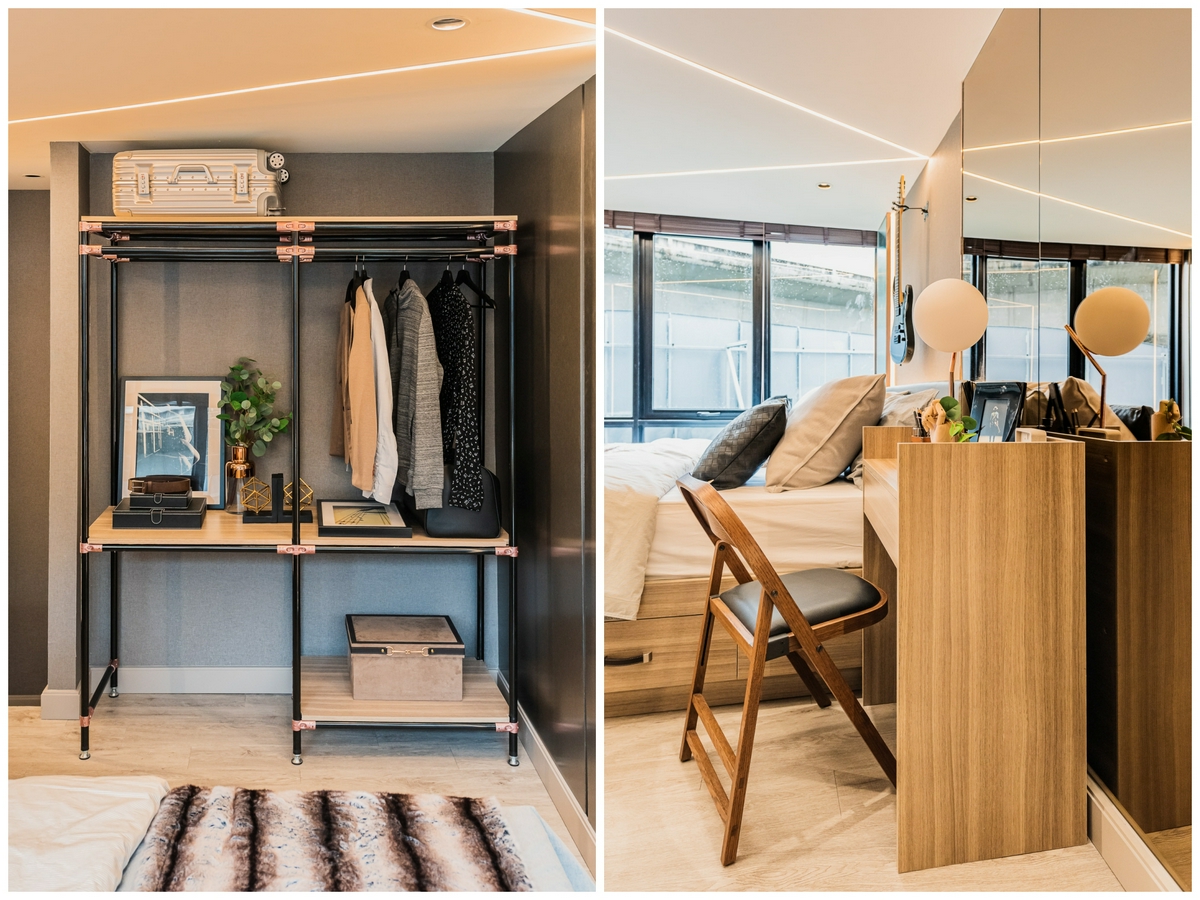 - ตู้เสื้อผ้าจะวางอยู่ทางด้านหลังของโต๊ะทำงาน สามารถเลือกได้ทั้งตู้แบบเปิดและแบบปิด ซึ่งเราอาจติดตั้งกระจกเงา กับชั้นวางของเพิ่มเติมเพื่อทำเป็นโต๊ะเครื่องแป้งเองได้ด้วย