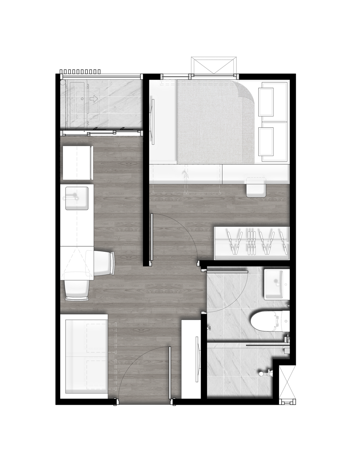 ห้อง 1 Bedroom ขนาด 24.07 ตร.ม. เป็นขนาดห้องที่พอเหมาะสำหรับการอาศัยอยู่คนเดียว ไปจนถึงการอยู่เป็นคู่ โดยสัดส่วนของห้องนี้จะให้ความสำคัญไปที่ห้องนอนเป็นพิเศษ เพื่อให้สอดรับกับชั่วโมงพักผ่อน มีความสูงจากพื้นห้องถึงเพดานอยู่ที่ 2.7 เมตร ซึ่งค่อนข้างสูงกว่าคอนโดทั่วไป ทำให้ห้องดูสูงโปร่ง และดูกว้างขวางมากขึ้น