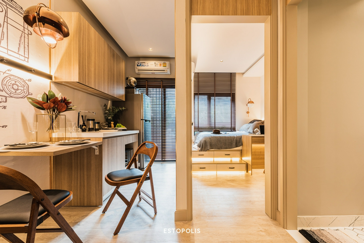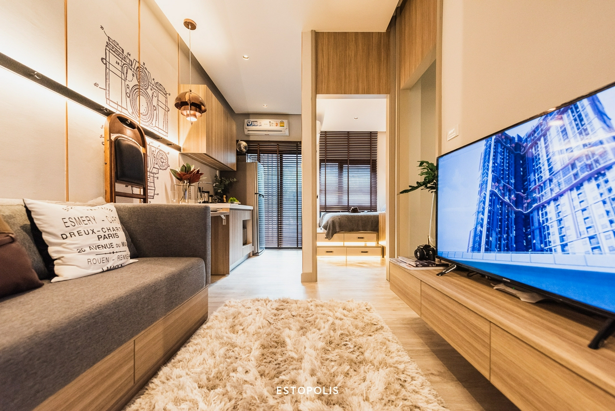 เมื่อเข้ามาในห้องจะเจอกับส่วนนั่งเล่นอยู่ด้านนอกสุด โดยจะมีประตูอยู่กึ่งกลางระหว่างโซฟากับชั้นวางทีวี ถัดไปทางขวามือจะเป็นทางเข้าห้องน้ำ และมีส่วนครัวเปิดอยู่ถัดขึ้นไปจากโซฟาอีกต่อหนึ่ง ก่อนจะไปเชื่อมกับระเบียงด้านในสุด ส่วนทางเข้าห้องนอนนั้นจะอยู่บริเวณตรงกลางห้อง ระหว่างครัวและห้องน้ำนั่นเอง