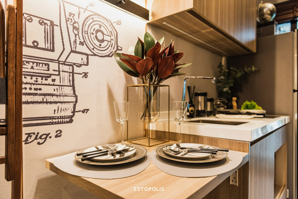 ส่วนด้านล่างเคาน์เตอร์ก็จะเว้นช่องไว้สำหรับไมโครเวฟพร้อมปลั๊กไฟที่ด้านหลัง โดยบริเวณท็อปครัวนั้น ทางโครงการจะให้ซิงก์ล้างจานสเตนเลสพร้อมก๊อกน้ำ และเตาไฟฟ้า 2 หัวจากแบรนด์ Teka มาให้เช่นเดียวกับห้อง Loft 1 Bedroom นอกจากนี้บริเวณผนังจะมีปลั๊กไฟสำหรับให้เสียบใช้งานเครื่องครัวอื่น ๆ อย่าง หม้อหุงข้าว หรือเครื่องทำแซนวิชได้