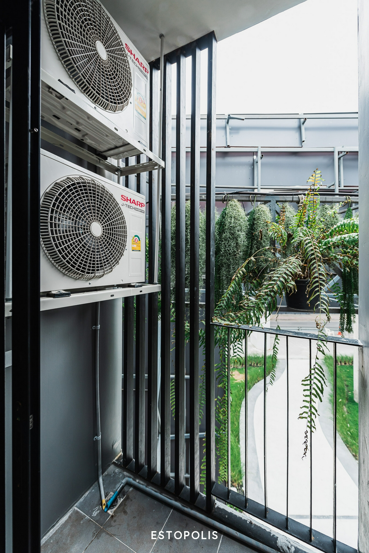 ไม่ต้องกังวลเรื่องคอมเพรสเซอร์แอร์ เพราะทางโครงการได้แขวนเอาไว้ที่ด้านบนกำแพง ทำให้สามารถใช้งานพื้นที่ได้อย่างเต็มที่ ส่วนราวระเบียงของห้อง Type นี้จะเป็นกระจกนิรภัย มองเห็นวิวเมืองได้เต็มสายตา โดยไม่มีอะไรมาบดบังบรรยากาศภายนอก ทั้งยามกลางวัน และกลางคืน