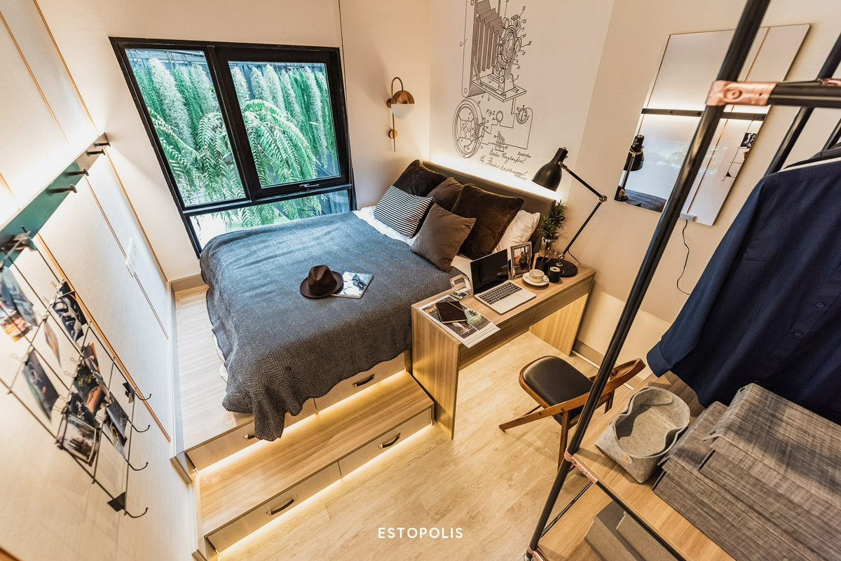 สำหรับฐานเตียงของห้อง Type นี้จะเป็นแบบยกระดับ พร้อมดีไซน์ใส่ลิ้นชักเก็บของ 4 บาน กับช่องลับลึกประมาณ 20 เซนติเมตรที่บริเวณปลายเตียงมาให้ด้วย เหมาะอย่างยิ่งสำหรับคนที่มีของเยอะ เพราะสามารถจัดเก็บข้าวของ หลบซ่อนสายตาภายนอกได้อย่างแนบเนียน จึงทำให้ห้องดูโปร่ง เรียบร้อย และไม่เกะกะสายตาอีกด้วย