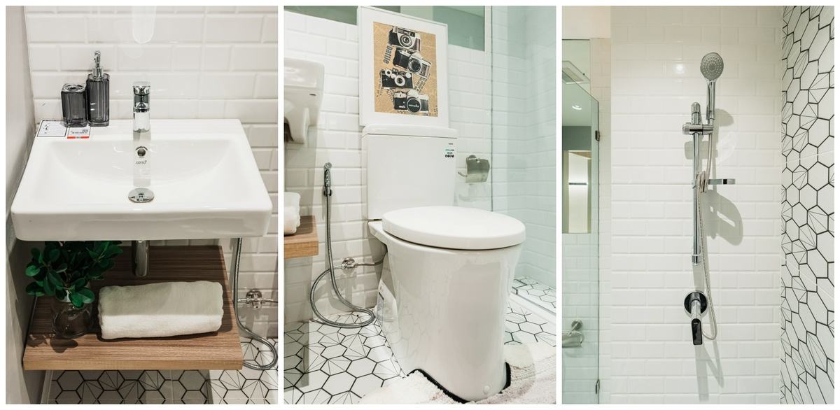 มาสำรวจต่อที่ ‘ห้องน้ำ’ กันบ้าง ซึ่งภายในห้องน้ำจะแบ่งออกเป็นส่วนเปียกและแห้ง สำหรับส่วนแรกที่เปิดประตูเข้าไปเจอจะเป็นโซนแห้ง ประกอบไปด้วย อ่างล้างหน้าและโถสุขภัณฑ์ ส่วนกระจกเงาที่ได้ก็มีขนาดจุใจ ยาวเต็มพื้นที่ของส่วนแห้งเลยทีเดียว โดยด้านในสุดเป็นพื้นที่ของส่วนเปียกที่กั้นด้วยพาร์ทิชัน กระจกใส เพื่อป้องกันไม่ให้น้ำจากฝักบัวกระเด็นออกมาเปียกส่วนแห้งนั่นเอง