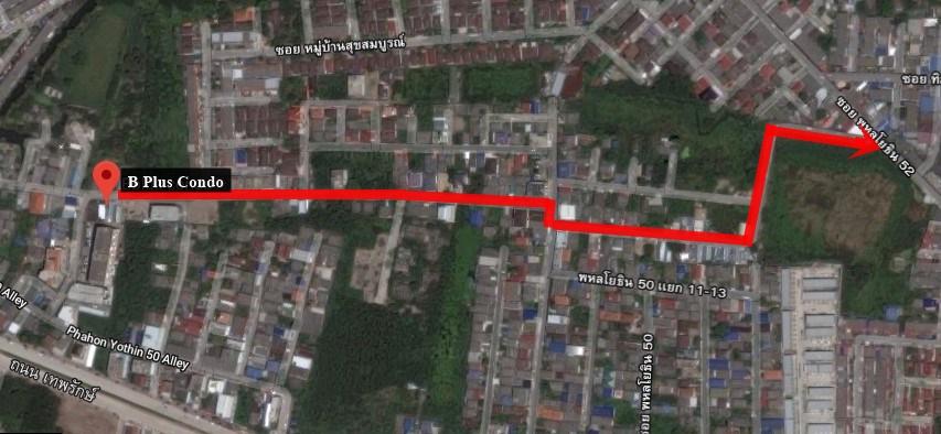 แผนที่จากปากซอยพหลโยธิน 50 เข้าสู่ตัวโครการ B Plus Condo (บี พลัส คอนโด)