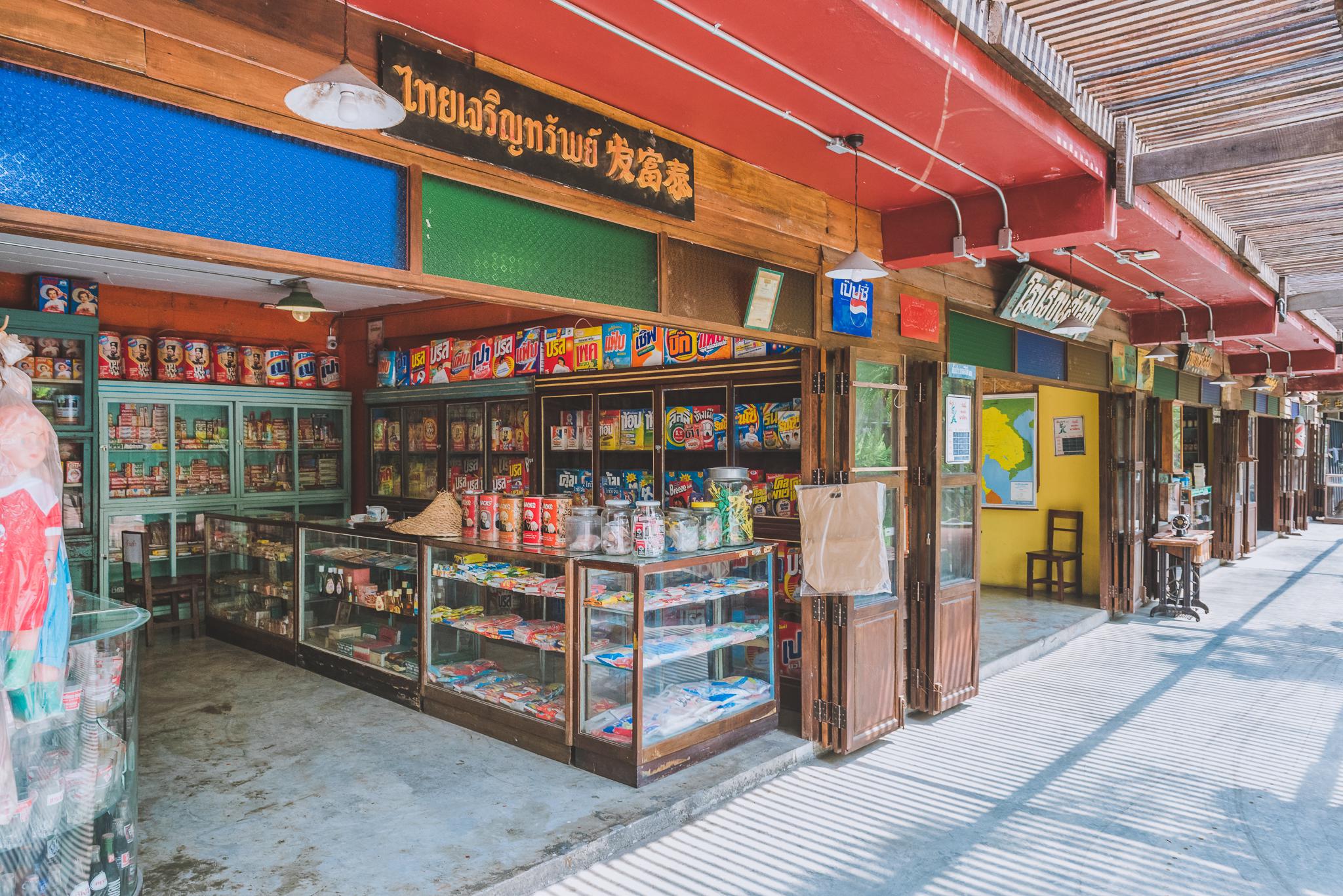 ใครที่เคยไปเยี่ยมเยือน ‘เพลินวาน’ ที่หัวหินมาก่อน อาจจะรู้สึกว่าที่นี่มีสไตล์และกลิ่นอายที่คล้ายกัน เพราะมีการจัดแสดงร้านค้าต่างๆ แบบย้อนยุค ทั้งร้านขายของชำสมัยก่อน ที่รวมเอาของบางอย่าง บางยี่ห้อที่ไม่มีผลิตแล้วมาให้ชม เช่น แฟ้บ นอกจากนี้ยังมีร้านขายยา, ร้านตัดผม, ร้านขายของโบราณ และบรรยากาศห้องเรียนเก่าๆ ที่เราหลายๆ คนคิดถึง จัดไว้ให้ชมกันอีกด้วย