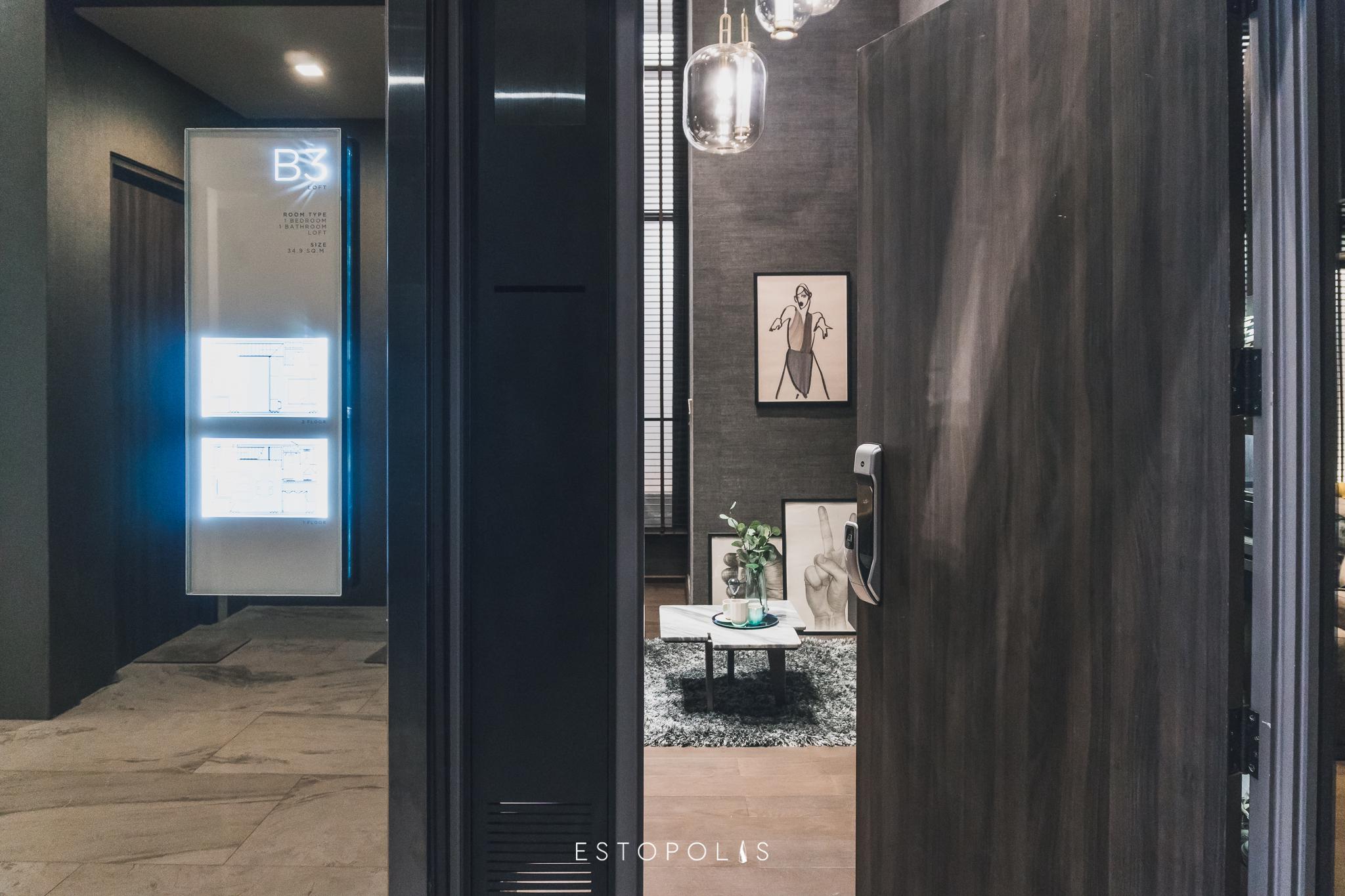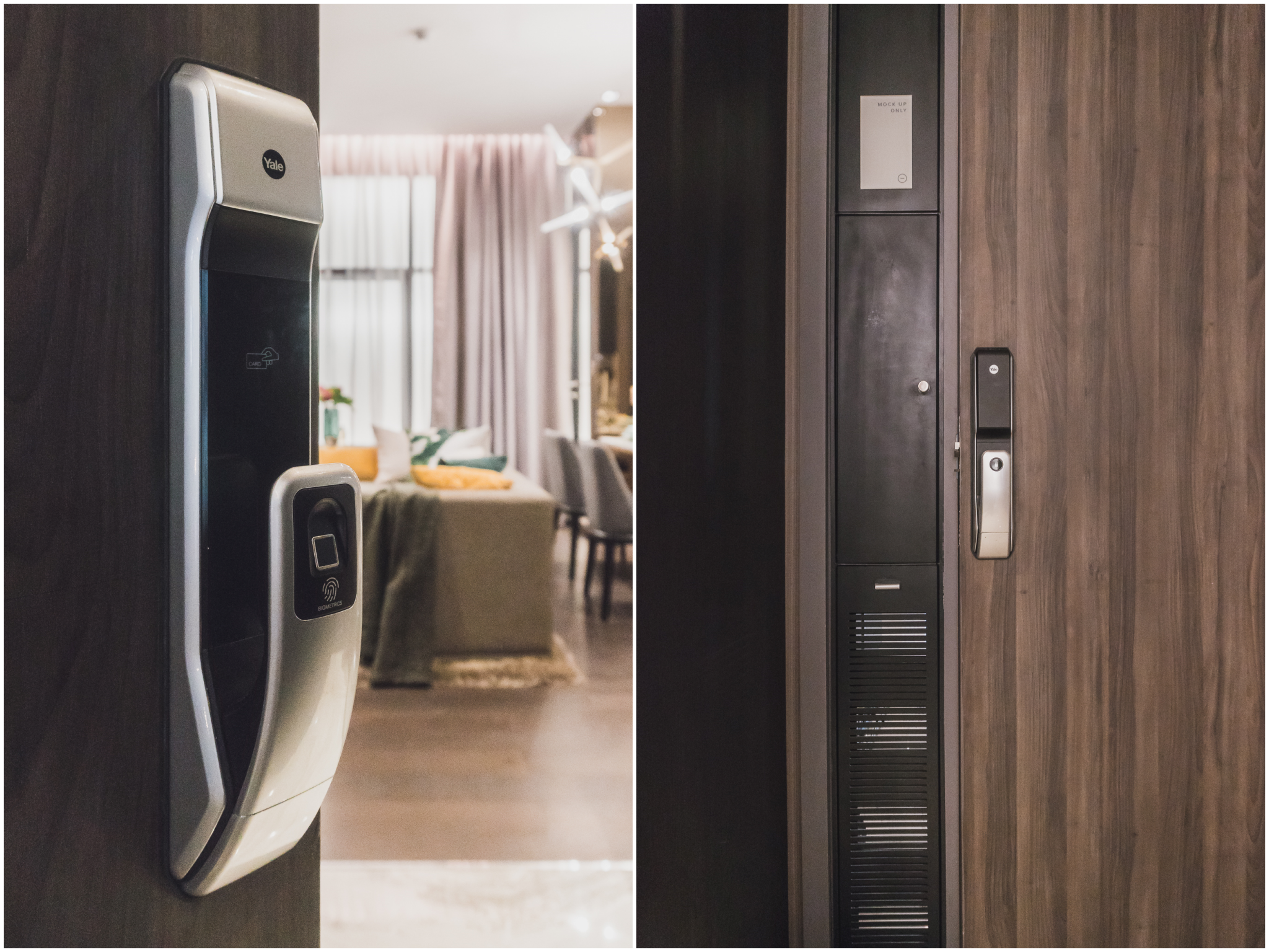 ประตูห้องเป็นแบบ Digital Door Lock จาก Yale ที่สามารถปลดล็อคได้ถึง 4 ระบบ ผ่านทางคีย์การ์ด, กุญแจ, ลายนิ้วมือและรหัสผ่าน ให้ความทั้งปลอดภัยและหมดกังวลเรื่องการลืมกุญแจไว้ภายในห้องพักไปเลย ส่วนด้านข้างประตูจะมีกล่อง Mailbox สำหรับใส่จดหมายที่ทางนิติของอาคารนำมาส่งให้เราถึงหน้าประตูห้อง