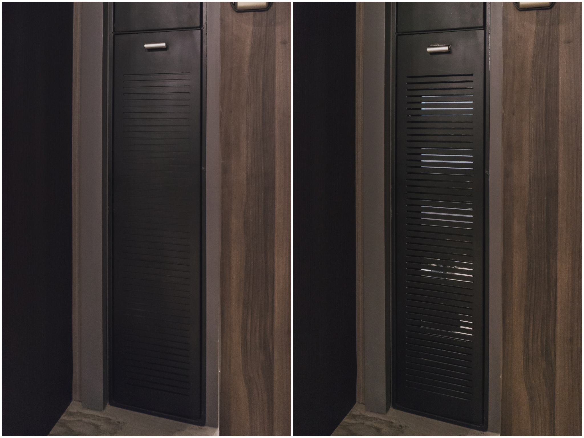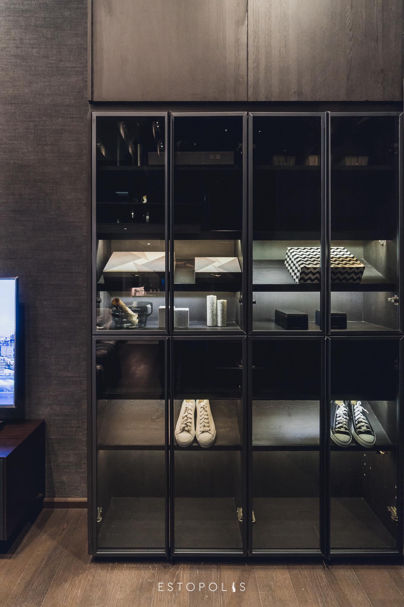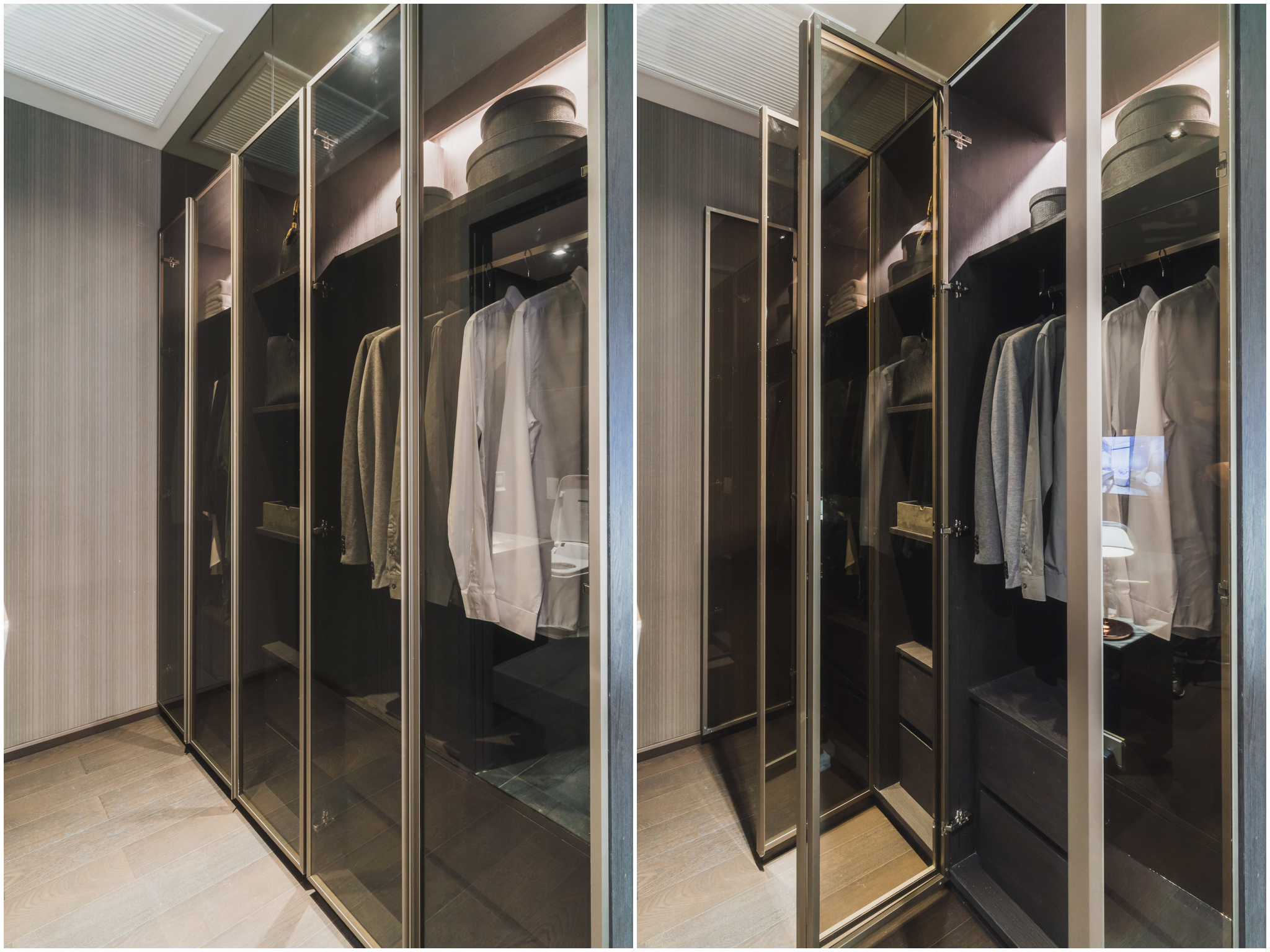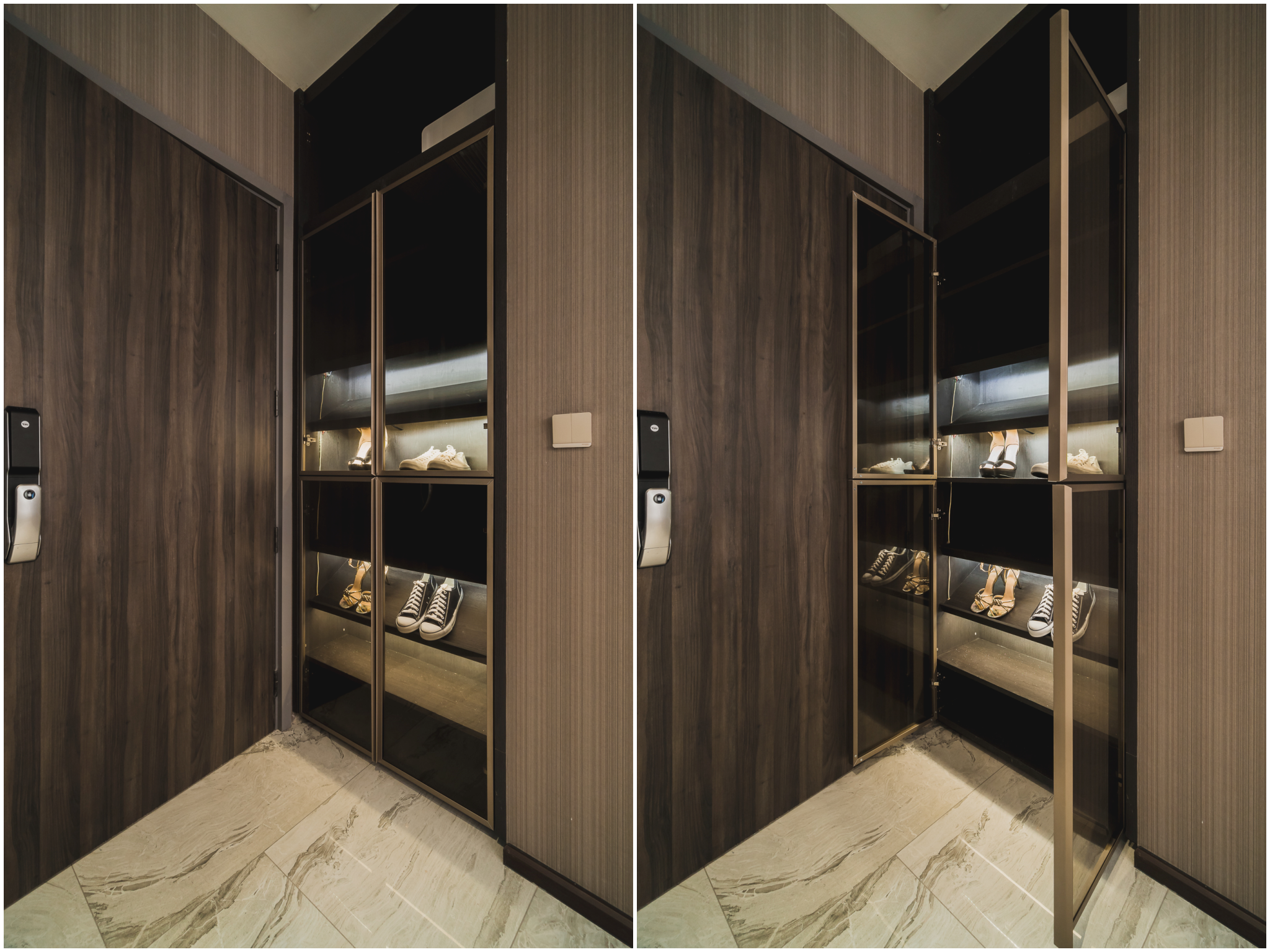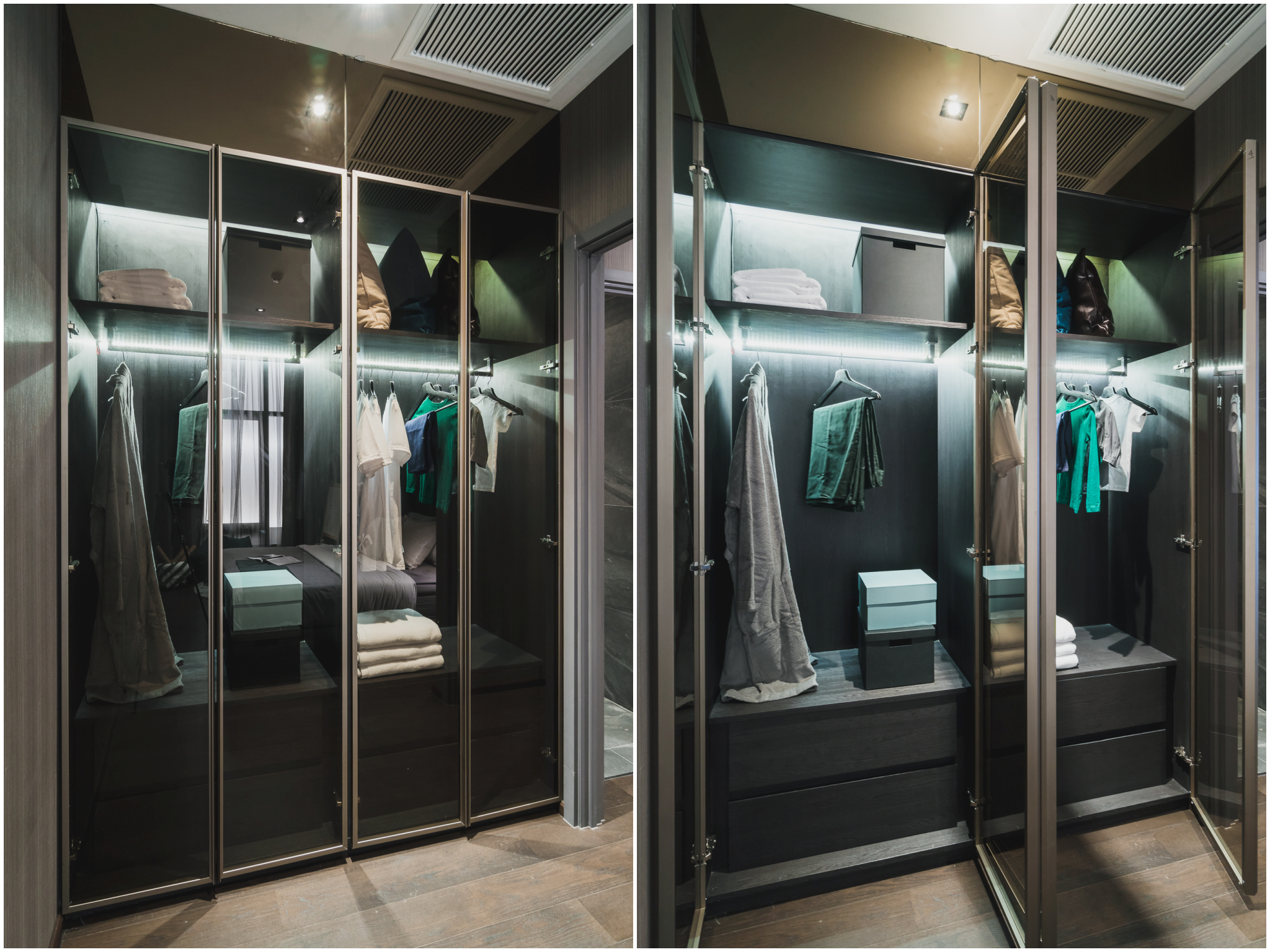 ตู้เก็บของพร้อมตู้ใส่รองเท้าแบบบิลท์อิน (Built-in) หน้าบานกรุด้วยกระจกสีชา ตั้งอยู่ทางขวาของประตูห้อง ภายในติดตั้งไฟ led เพื่อความสะดวกในการใช้สอย ทำให้เราสามารถใช้เป็นตู้โชว์ของสะสมหรือของแต่งห้องได้ และเหนือขึ้นไปจะเป็นตู้ไม้ขนาดใหญ่ที่ให้เราเก็บของต่างๆ ได้อย่างเป็นระเบียบ