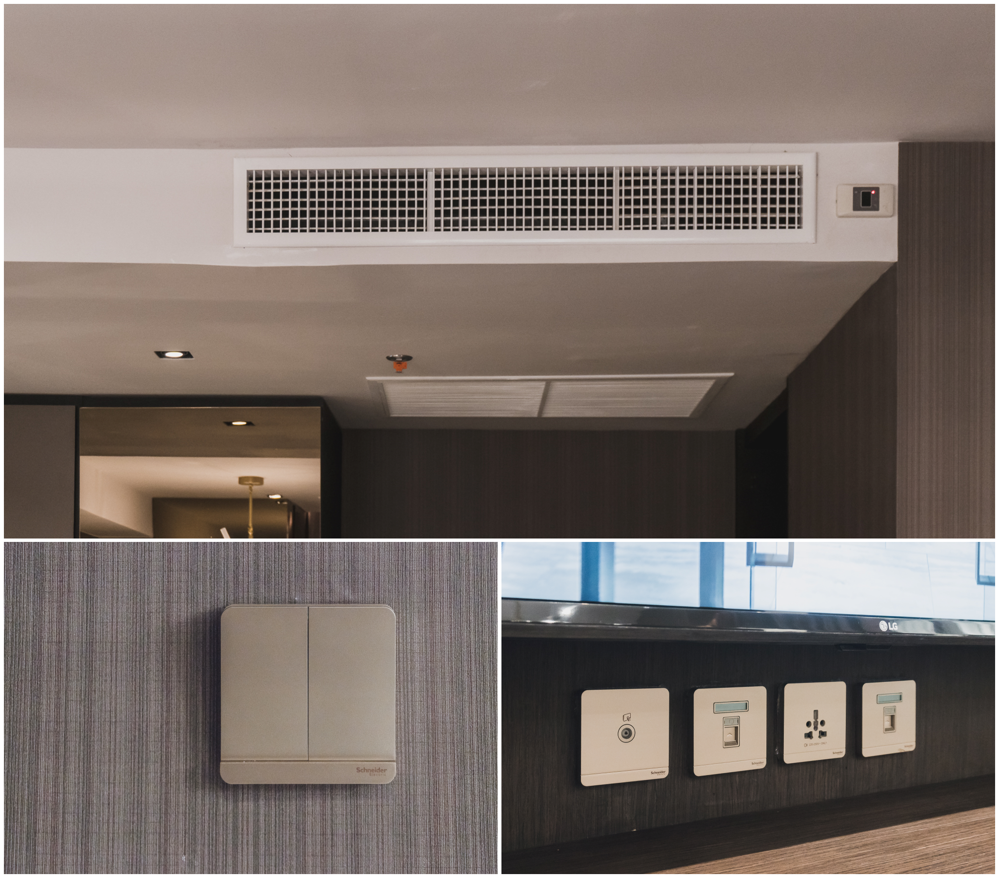 ทางโครงการ CONNER Ratchathewi (คอนเนอร์ ราชเทวี) ใส่ใจในรายละเอียดทุกๆ ตารางเมตรของห้อง จึงเลือกที่จะติดตั้งสวิตซ์ไฟ, เต้าเสียบปรับ รวมถึงจุดพ่วงสายเคเบิลเป็นสีทองดูหรูหรา ภายใต้ดีไซน์เรียบหรูจากแบรนด์ Schneider พร้อมทั้งติดตั้งเครื่องปรับอากาศแบบฝังฝ้าจาก Daikin หรือเทียบเท่าไว้ให้ โดยภายในห้องจริงจะติดตั้งเครื่องปรับอากาศให้ 3 ตัวด้วยกัน ได้แก่ บริเวณพื้นที่นั่งเล่น, Master Bedroom และห้องนอนเล็ก