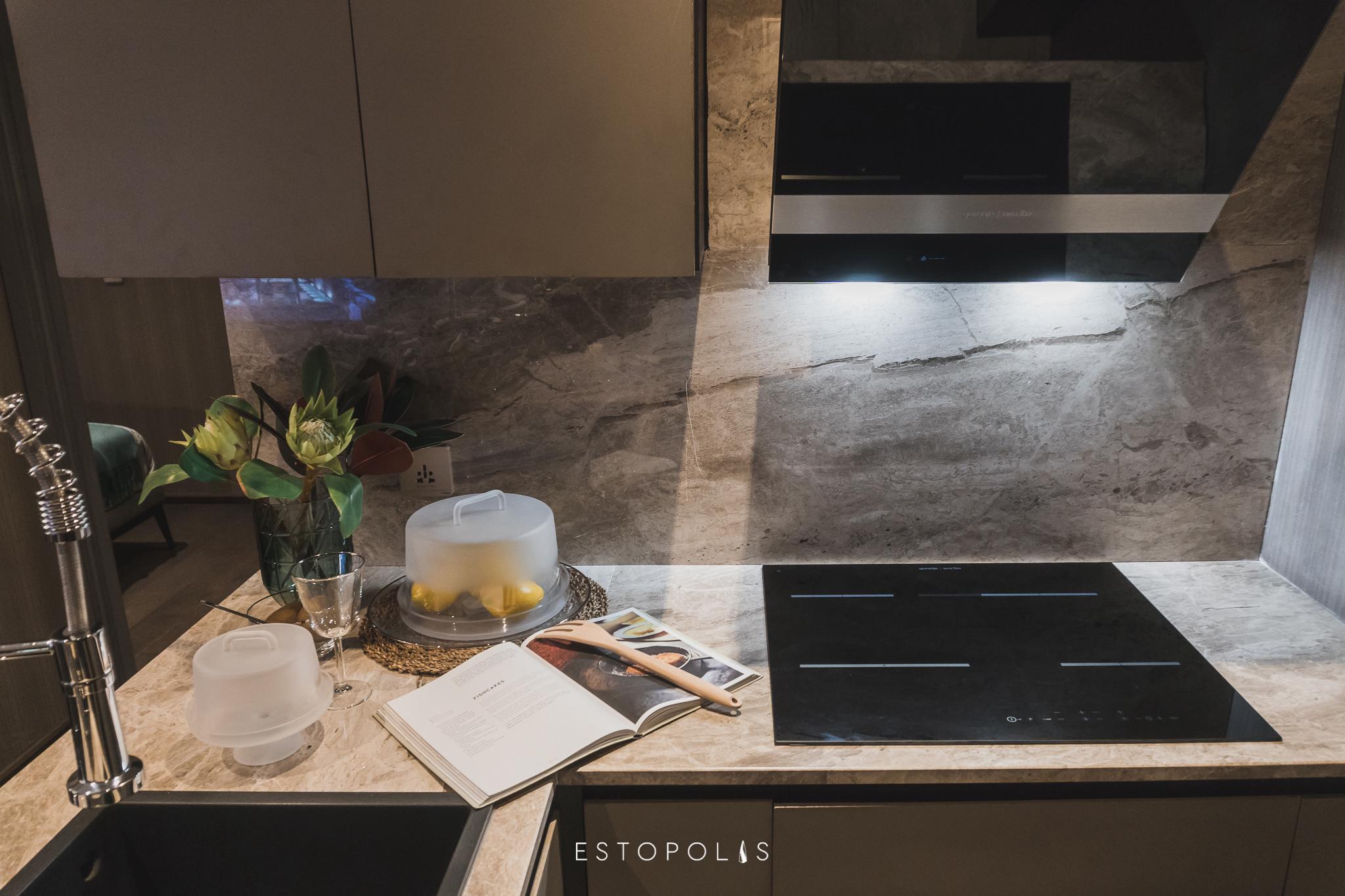 ภายในห้องครัวจะถูกออกแบบพื้นที่ให้ง่ายต่อการทำความสะอาด ด้วยการเลือกใช้กระเบื้องพอร์ซเลนสีขาวในการปูพื้นตัดกับผนังหินอ่อนสีดำ พร้อมบิลท์อินเคาน์เตอร์ไม้สีโอวัลติน ท็อปครัวด้วยหินอ่อนสีเทา