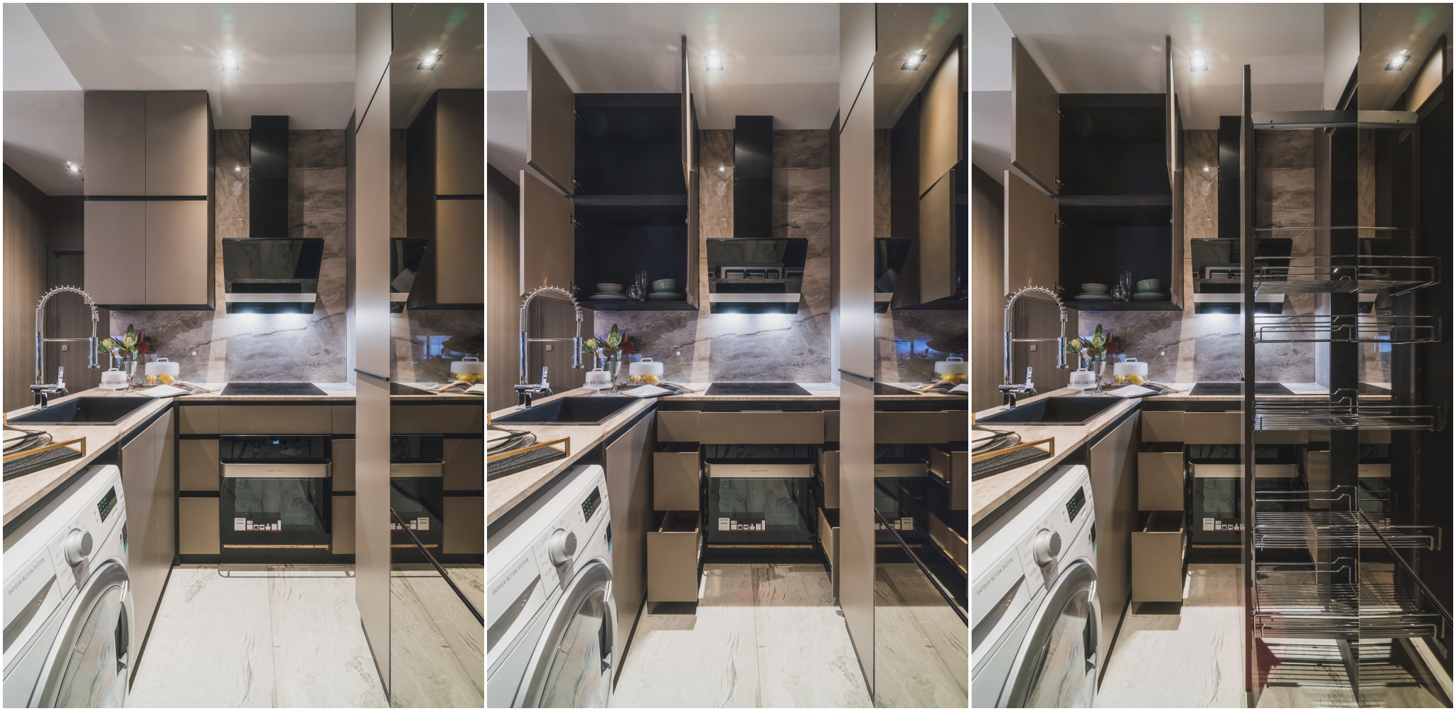 บริเวณเคาน์เตอร์ครัวมีการออกแบบเป็นตู้ไม้ใส่ของ บานเปิด-ปิดแบบ Soft close เพื่อรองรับการเก็บข้าวของเครื่องใช้ต่างๆ ภายในครัว พร้อมทั้งบิลท์อิน (Built-in) ชั้นวางจานให้เราสามารถเก็บจานชามไว้ใกล้ๆ มือ สามารถหยิบใช้งานได้สะดวก