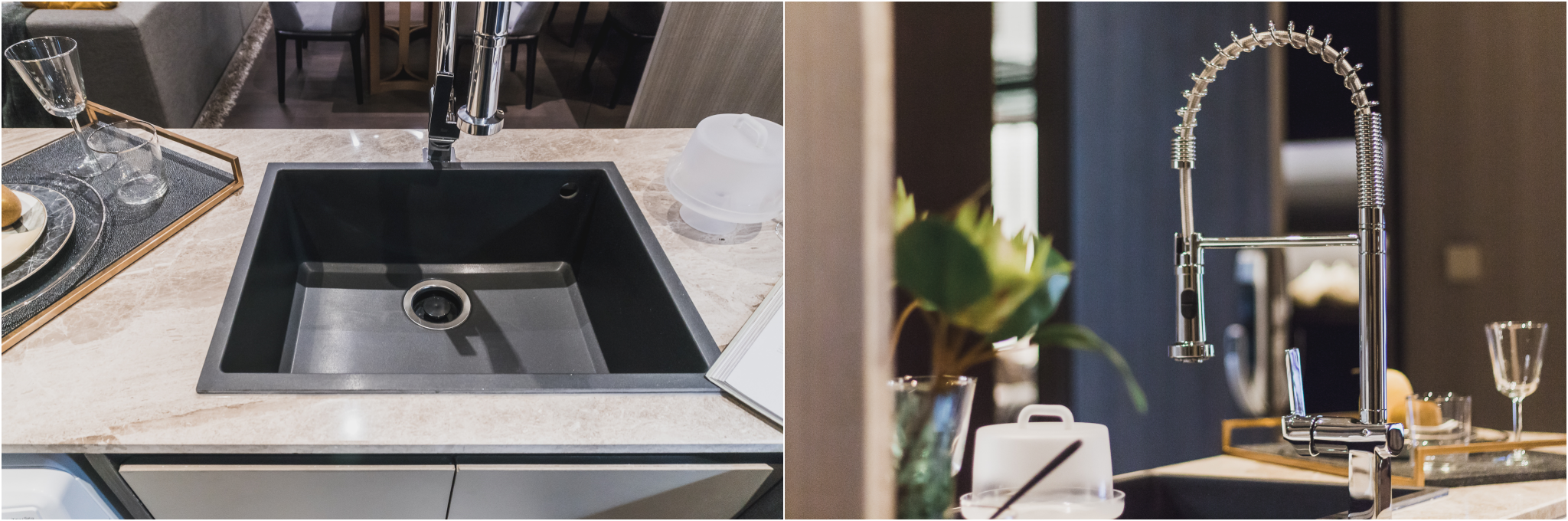 เมื่อสนุกกับการทำอาหารกันไปแล้ว ก็มาปิดท้ายด้วยงานเช็ดล้างทำความสะอาดจานชาม โดยทางโครงการได้ติดตั้งซิงค์ล้างจานทรงสี่เหลี่ยมก้นลึกจาก Teka ที่มาพร้อมกับก๊อกน้ำแบบดึงออกได้ ให้เราสามารถทำความสะอาดสิ่งต่างๆ ได้อย่างง่ายดายและสะดวกสบายมากขึ้น