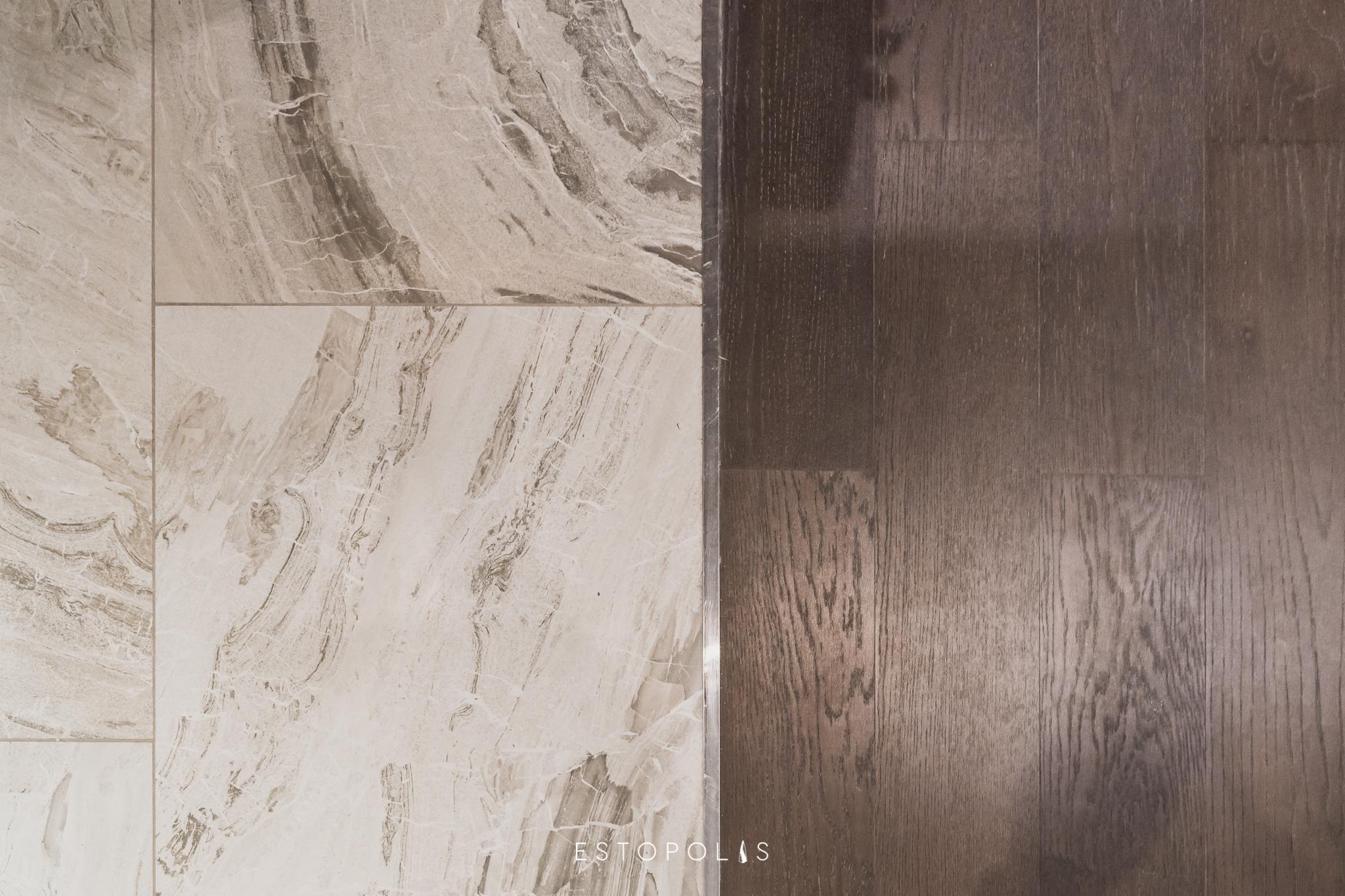 บริเวณพื้นของห้องครัวจะปูด้วย 'กระเบื้องพอร์ซเลน' ของ Cotto Italia เพื่อรองรับกิจกรรมการประกอบอาหารและให้เราสามารถดูแลรักษาความสะอาดพื้นที่ครัวได้ง่าย โดยโซนอื่นๆ ในห้องนั้นจะเปลี่ยนมาปูพื้นด้วย 'Engineering Wood' สีน้ำตาลเข้มเพื่อความสวยงาม