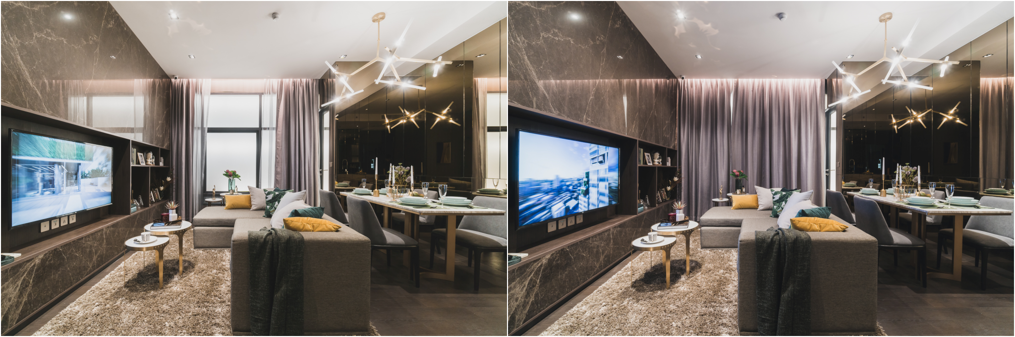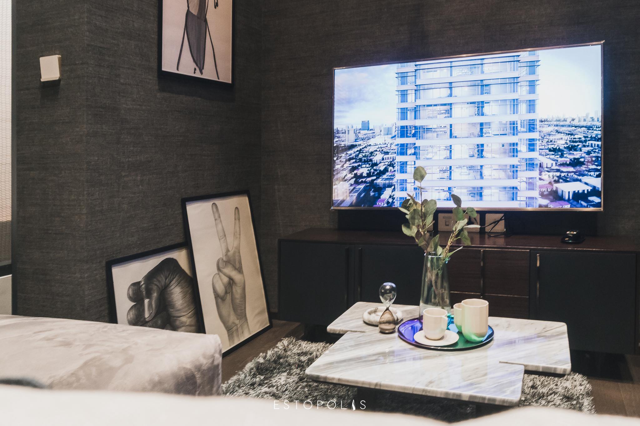 ระยะห่างหน้าโซฟากว้างพอที่จะบิลท์อิน (Built-in) ชั้นวางโทรทัศน์พร้อมติดตั้งทีวีขนาดใหญ่ได้โดยไม่ทำให้เสียสุขภาพตา นอกจากนี้ยังมี 'จุดชมวิว' ที่ให้เราได้มองเห็นวิวรอบๆ ผ่านทางหน้าต่างบานใหญ่กรุกระจกแบบตัดแสงสีเขียว ทำให้ห้องดูโปร่งโล่งขึ้นด้วยแสงธรรมชาติในตอนกลางวัน และให้แสงสวยงามในยามค่ำคืน ช่วยสร้างบรรยากาศผ่อนคลายไปได้อีกแบบ