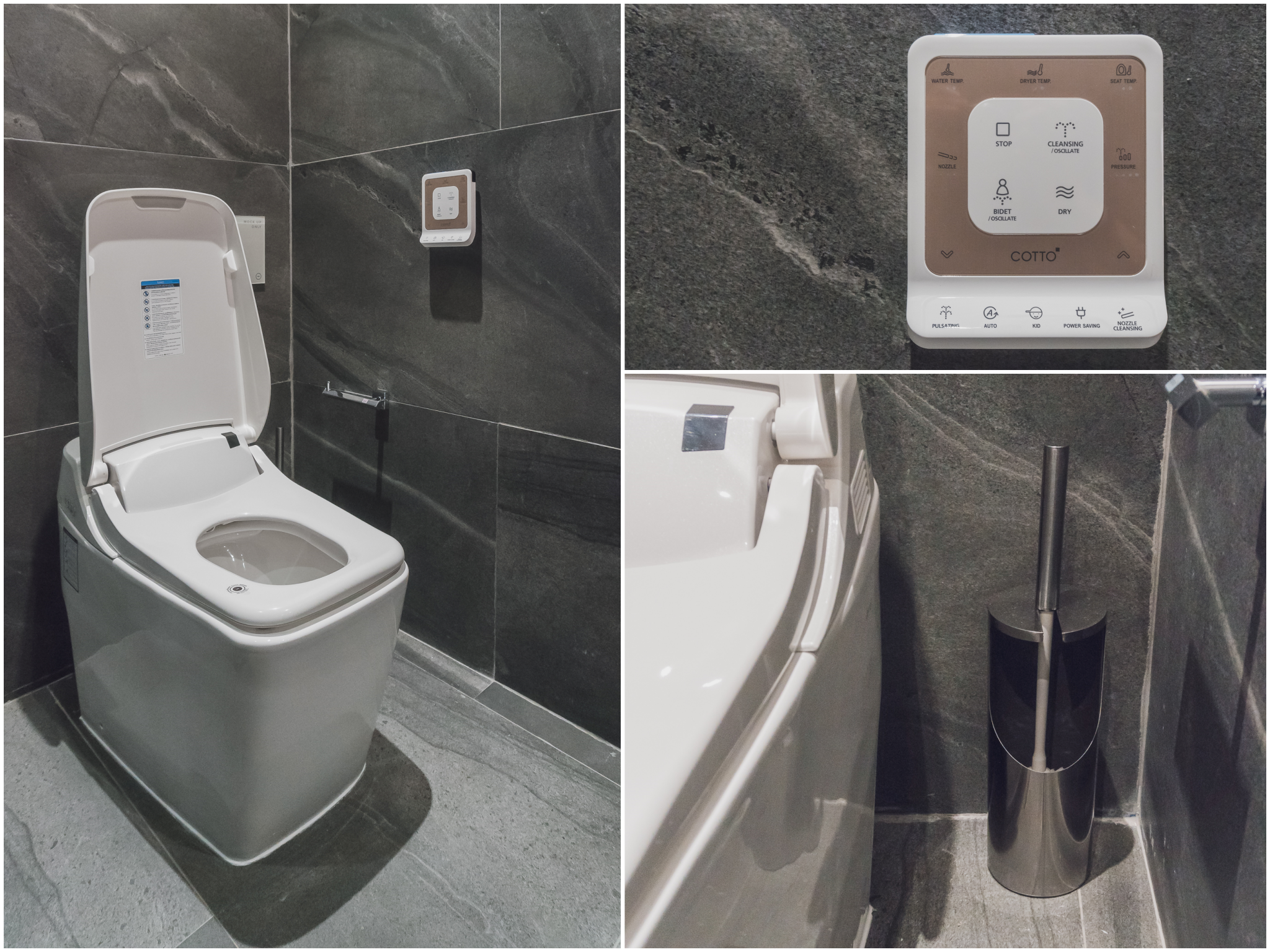 ห้องน้ำเป็นมาตรฐานเดียวกันทั้งโครงการ คือ จะได้สุขภัณฑ์จาก COTTO รุ่น TUNIO ที่ติดตั้งมาให้ครบชุด โดยชักโครกจะเป็นแบบ Dual Dlush ที่ช่วยในการประหยัดน้ำ พร้อมมีระบบทำความสะอาดอัตโนมัติแบบ Washlet ส่วนด้านข้างมีที่ใส่กระดาษทิชชูและแปรงขัดห้องน้ำเอาไว้ให้เรียบร้อย