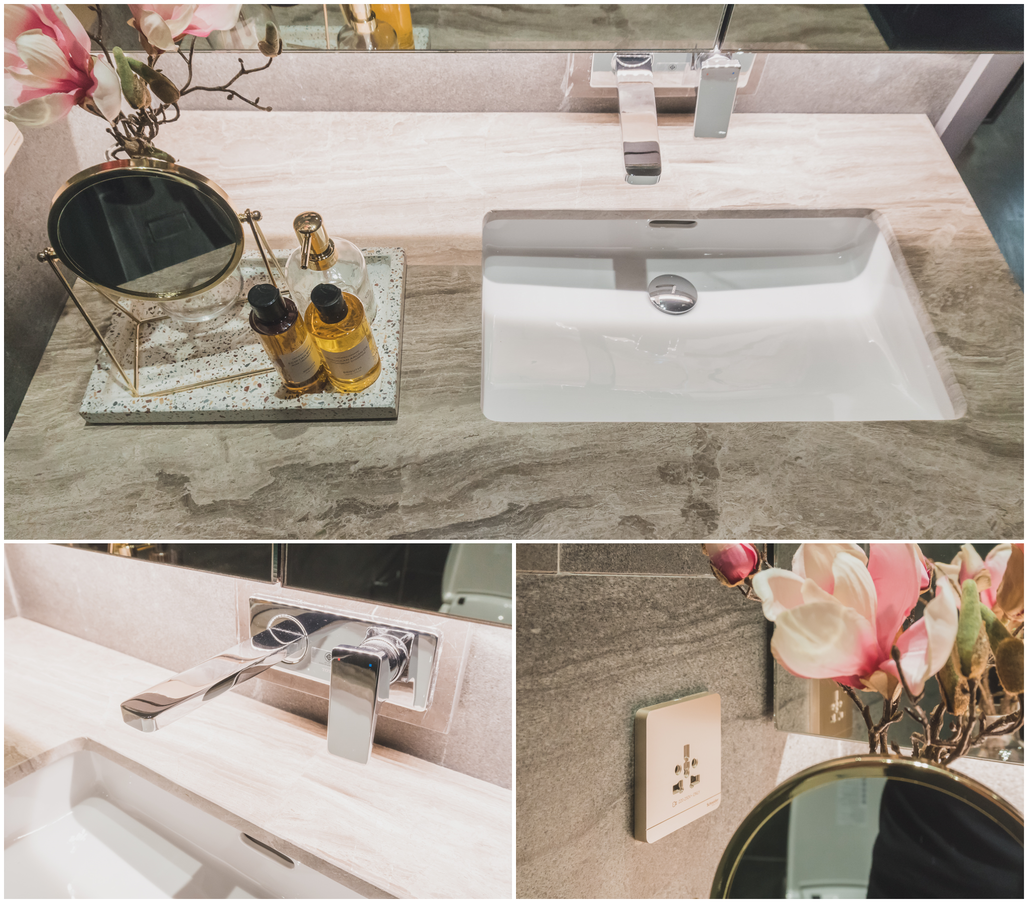 อ่างล้างหน้าจากแบรนด์ TOTO ติดตั้งแบบฝังลงบนเคาน์เตอร์ลายหินอ่อน ซึ่งมีขนาดพื้นที่อ่างกว้างพอสมควร โดยก็อกน้ำจะมีระบบทำน้ำร้อน-น้ำเย็นให้ ส่วนด้านข้างมีพื้นที่ให้เราวางของใช้ อย่าง สบู่ล้างมือหรือแปรงสีฟัน พร้อมกับติดตั้งเต้าเสียบปลั๊กสำหรับใช้งานเครื่องใช้ไฟฟ้าในห้องน้ำ