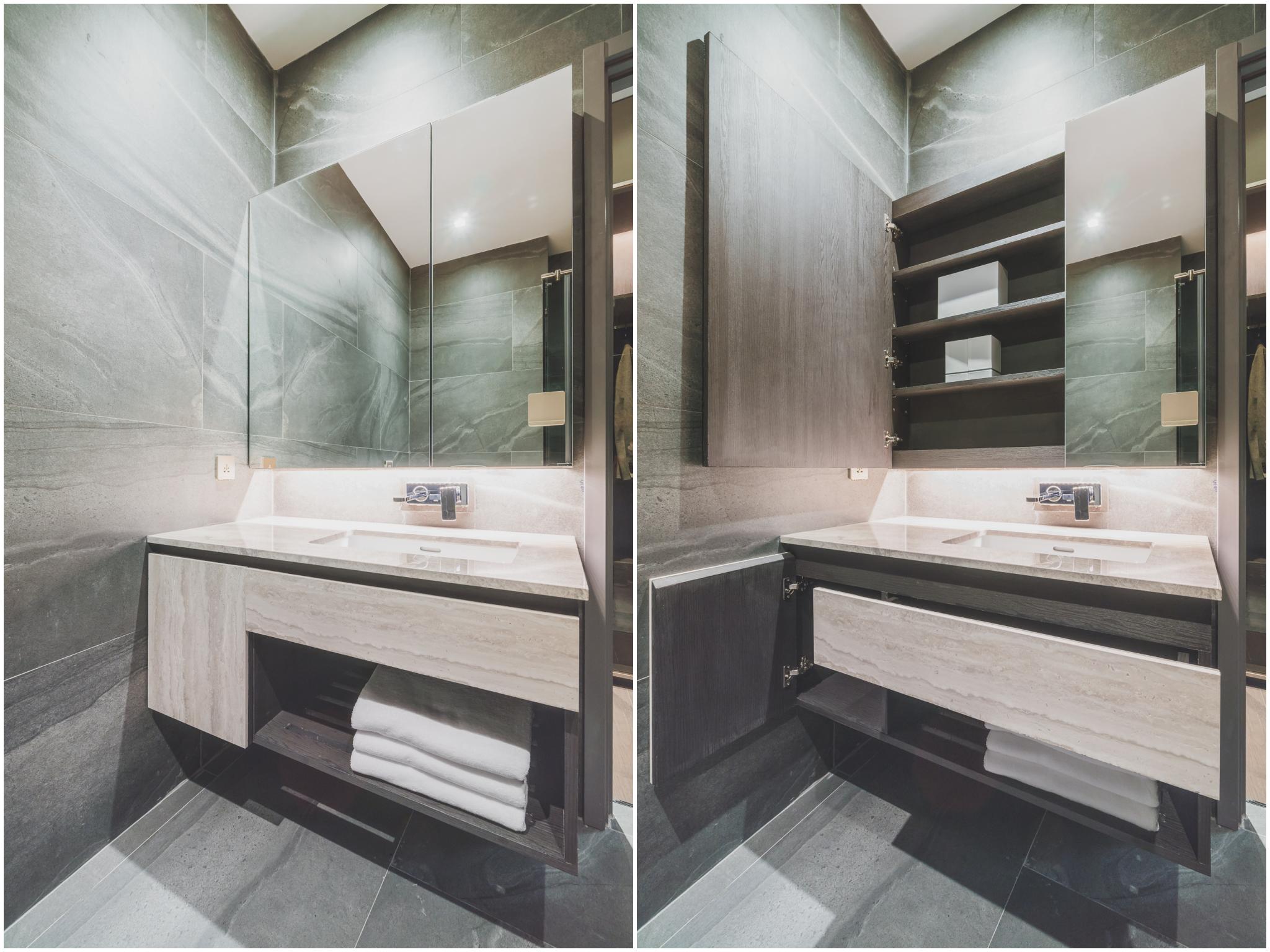 เหนืออ่างล้างหน้าเป็นกระจกบานใหญ่ที่ถูกออกแบบบิลท์อิน (ฺBuilt-in) ให้เป็นตู้เก็บของในตัว พร้อมติดไฟ led แบบซ่อนไว้ใต้ตู้ เพื่อเพิ่มความสว่างและความสวยงามขณะใช้งาน ส่วนด้านล่างอ่างล้างหน้าออกแบบเป็นชั้นเก็บของ ที่แยกฟังก์ชันเอาไว้ให้เราวางผ้าเช็ดตัว, ผ้าเช็ดหน้าและผลิตภัณฑ์ทำความสะอาดอื่นๆ เพิ่มเติมได้