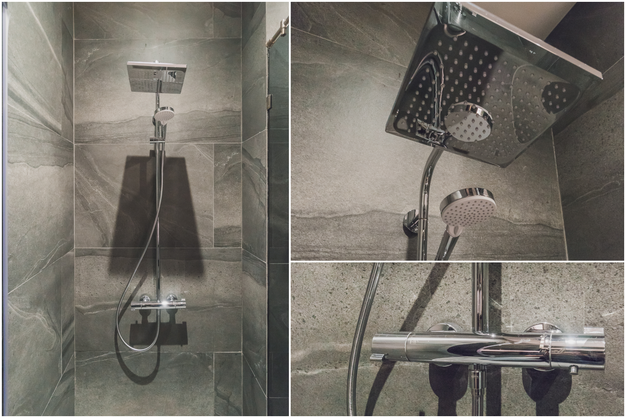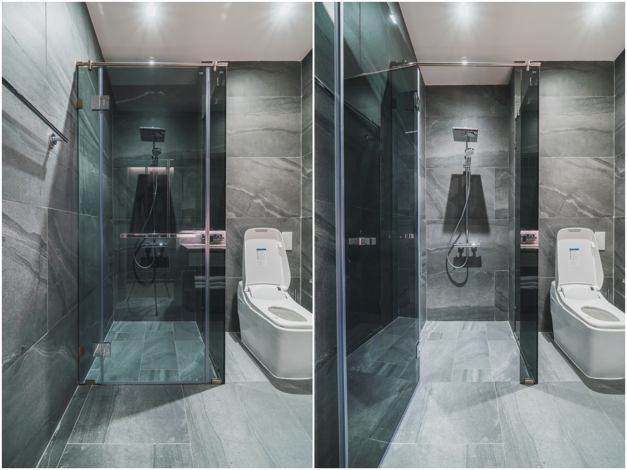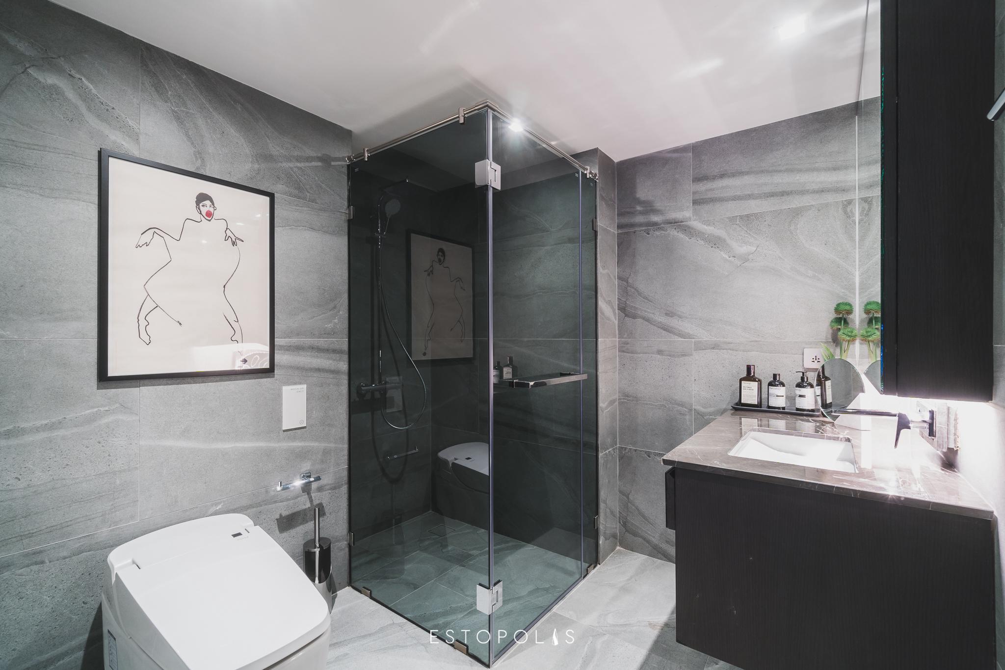 ภายในติดตั้งฝักบัวยี่ห้อ Hansgrohe ดีไซน์โมเดิร์น โดยมีฟังก์ชันการใช้งานให้เลือกทั้งแบบ Hand Shower และ Rain Shower พร้อมติดตั้งระบบปรับอุณหภูมิมาให้ในตัว เพื่อเพิ่มความสุขให้กับการอาบน้ำในแต่ละครั้ง