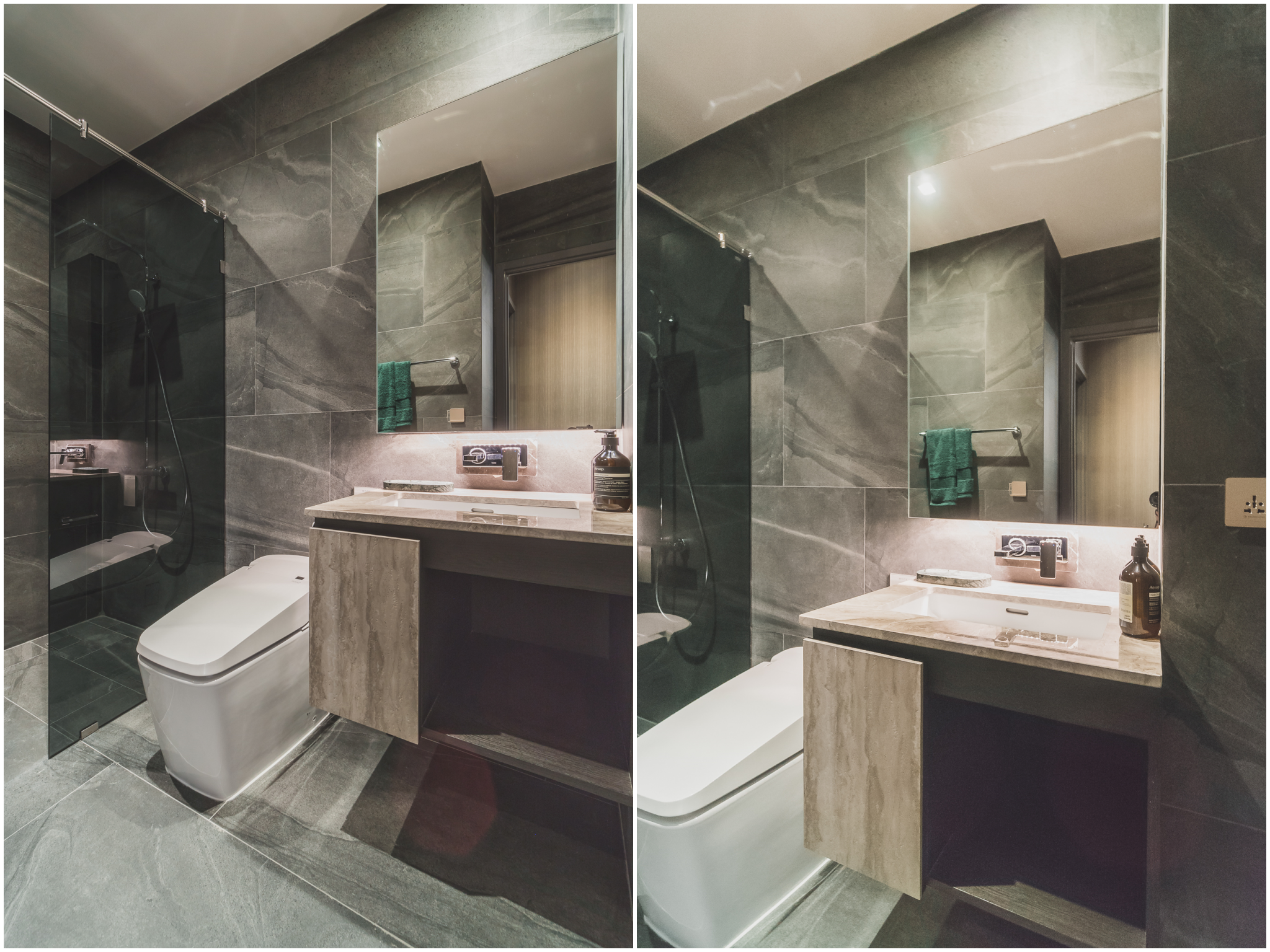 พื้นและผนังห้องน้ำปูด้วยกระเบื้องพอร์ซเลนสีเทาเรียบหรู โดยทางโครงการ CONNER Ratchathewi (คอนเนอร์ ราชเทวี) ได้จัดการแยกส่วนเปียกและส่วนแห้งไว้ให้เรียบร้อย พร้อมติดตั้งโถสุขภัณฑ์ไว้ใกล้ๆ กับอ่างล้างหน้า และมีราวแขวนผ้าให้อยู่ข้างกันในส่วนแห้ง