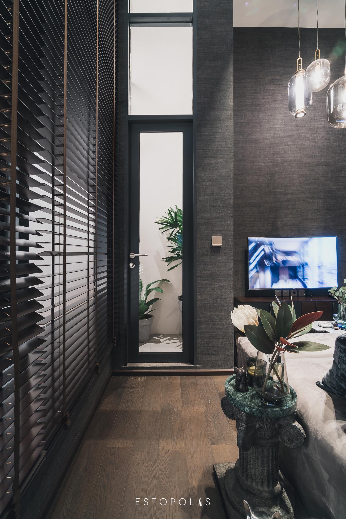 เปิดประตูเข้ามาในห้อง เราจะได้เจอกับห้องที่โปร่งสบาย ด้วยความสูง Floor to Ceiling ถึง 3 เมตร พร้อมติดตั้งไฟดาวน์ไลท์ แสงวอร์มไลท์ไว้ทั่วห้อง ทำให้ห้องดูสว่างและอบอุ่นไปในตัว