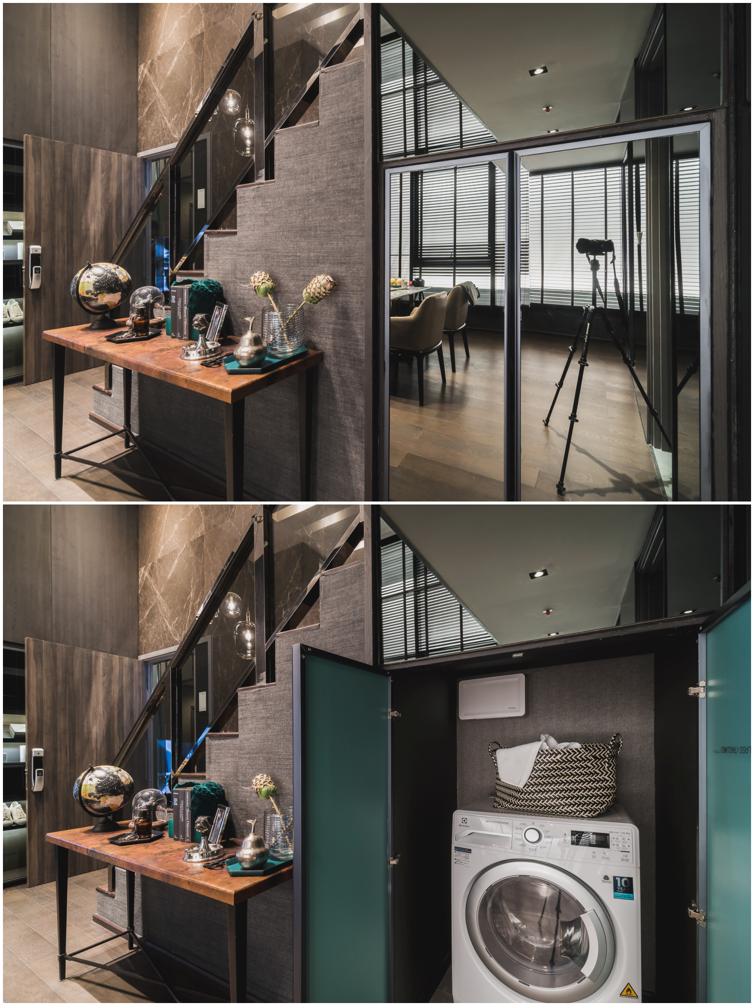 บริเวณใต้บันไดขึ้นสู่ชั้น Loft จะถูกออกแบบให้เป็น 'ห้องเก็บของ' ภายในติดตั้งระบบท่อน้ำไว้ให้เรียบร้อย ซึ่งเราอาจใช้บริเวณนี้เป็นที่วางเครื่องซักผ้า โดยเครื่องซักผ้าที่ทางโครงการ CONNER Ratchathewi (คอนเนอร์ ราชเทวี) นำมาตั้งโชว์นั้นจะเป็นของยี่ห้อ Electrolux ขนาด 7 กิโลกรัม แต่สำหรับห้องรูปแบบนี้ไม่ได้มีเครื่องซักผ้าแถมมาด้วย