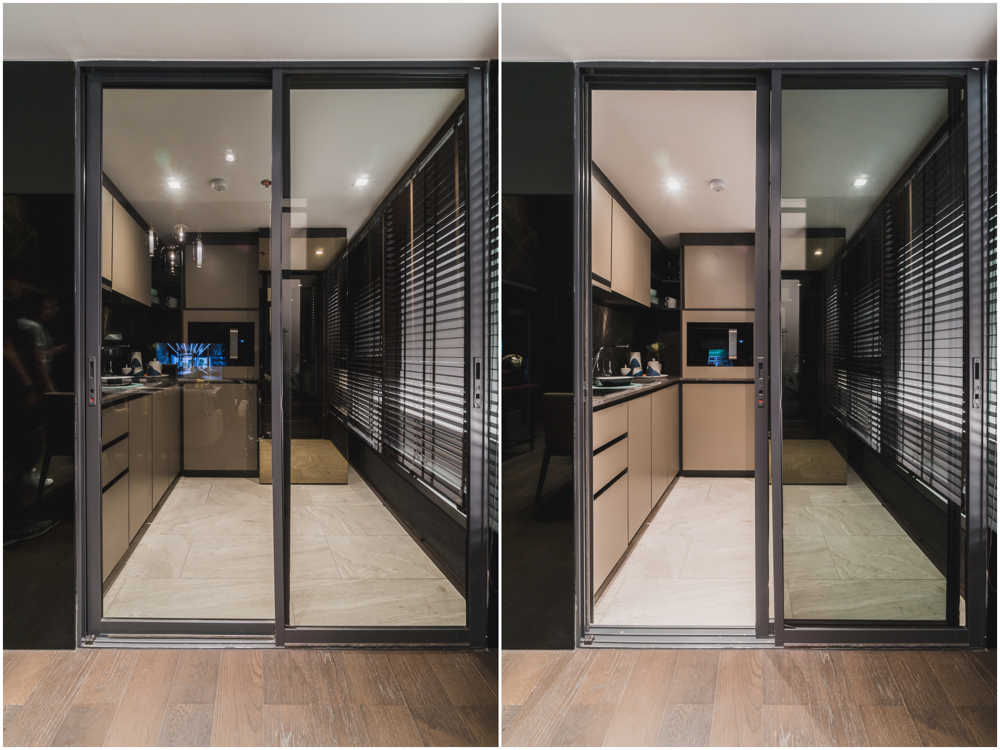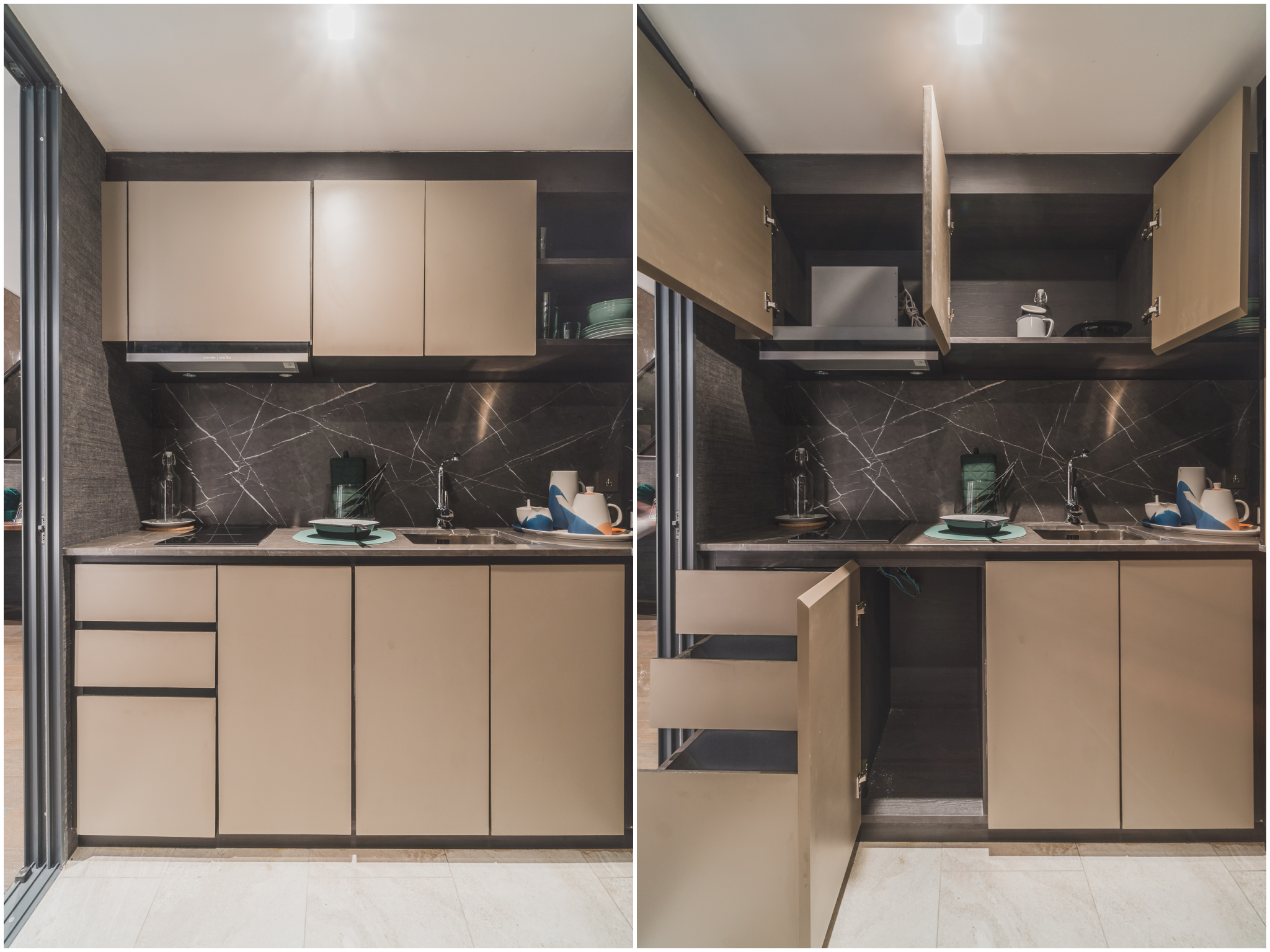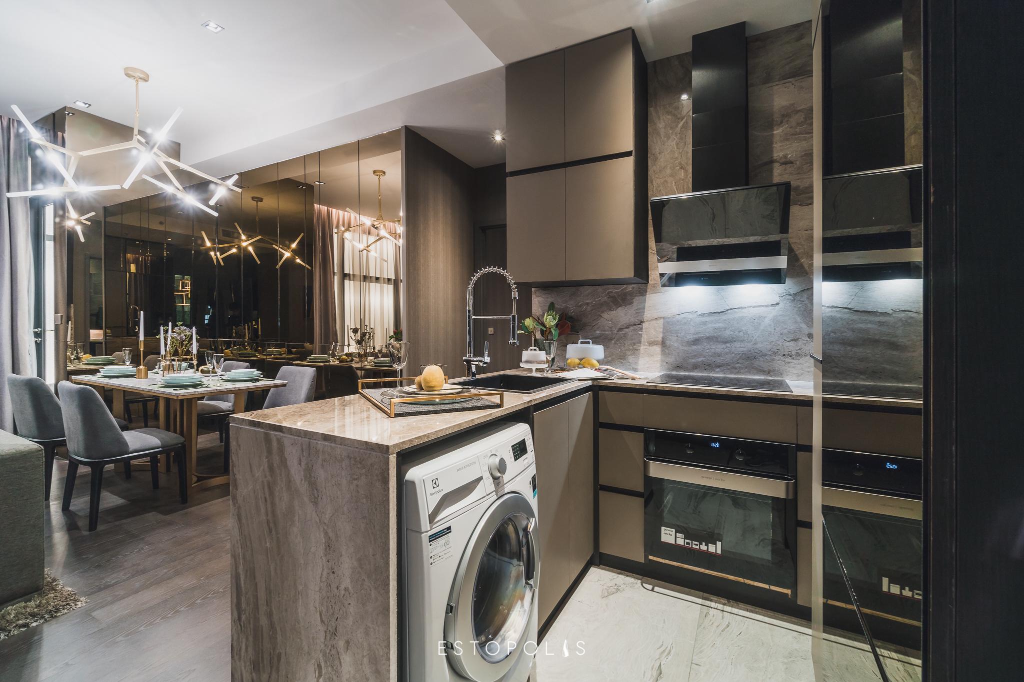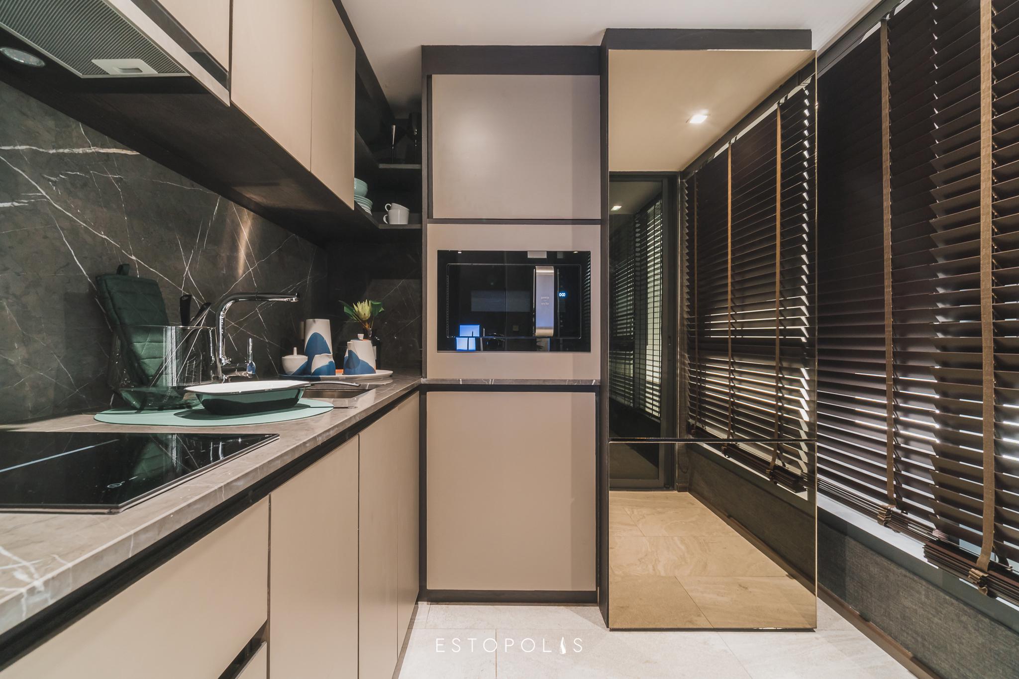 เอาใจคนรักการทำอาหารด้วย 'ห้องครัวแบบปิด' ที่ถูกกั้นแยกจากส่วนอื่นๆ ของห้องด้วยพาร์ติชั่นบานเลื่อนกระจก 2 ตอน ช่วยป้องกันกลิ่นและควันจากการทำอาหารไม่ให้ออกมารบกวนส่วนอื่นๆ ในห้องได้เป็นอย่างดี